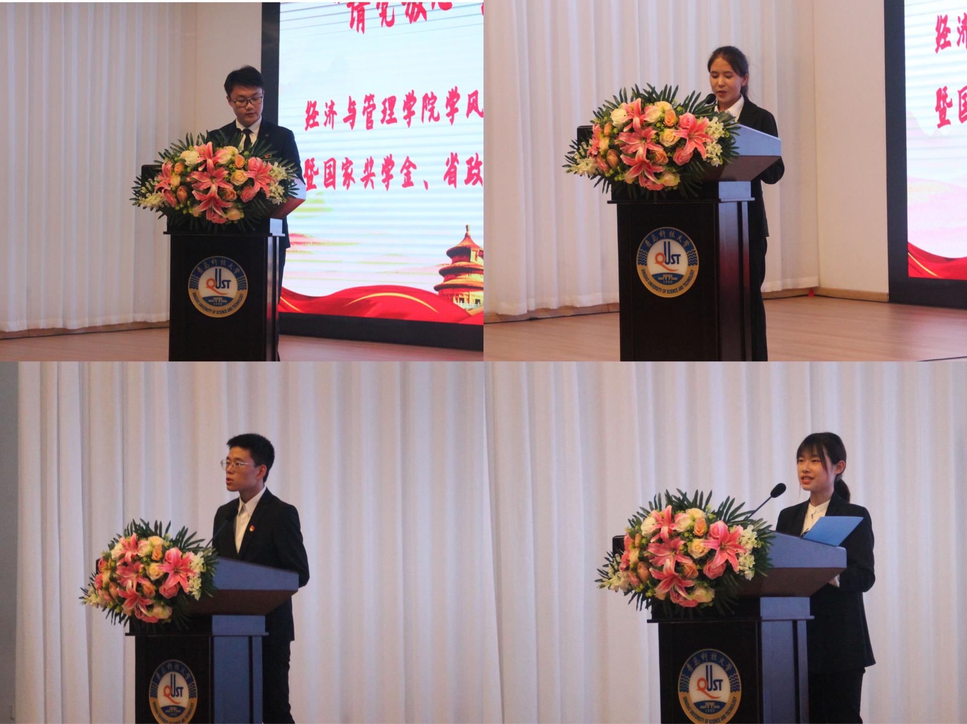 启动仪式上,团委书记王聪宣读了《关于开展“请党放心 强国有我”tyc1286太阳成集团学风建设月的通知》。团委副书记张显全宣读了《tyc1286太阳成集团获得省级以上荣誉称号名单》,党委副书记刘跃宁、副院长宫攀为获得省级以上荣誉称号的学生颁奖,2019-2020学年国家/省政府奖学金获得者代表物流182班彭承琪、财务181班王倩、工业182班高广旭分别做了经验交流和成果汇报。