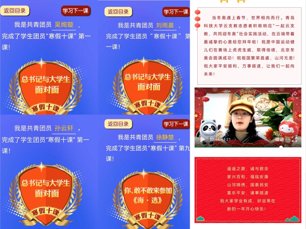 多措并举,鼓励学生假期“充电”。组织同学们认真学习团中央针对学生团员制作推出的“寒假十课”,结合“北京冬奥会”热点,激发冬奥会的思想政治教育功能和元素,引领青年学生在保证个人安全的前提下,积极关注、参与、体验冬奥会,统筹学生参与意识、学习态度、团队协作、进取精神、意志品质等,增强青年学生的民族自信心和国家认同感,切实推动体育与思政深度融合贯通效果的实现。