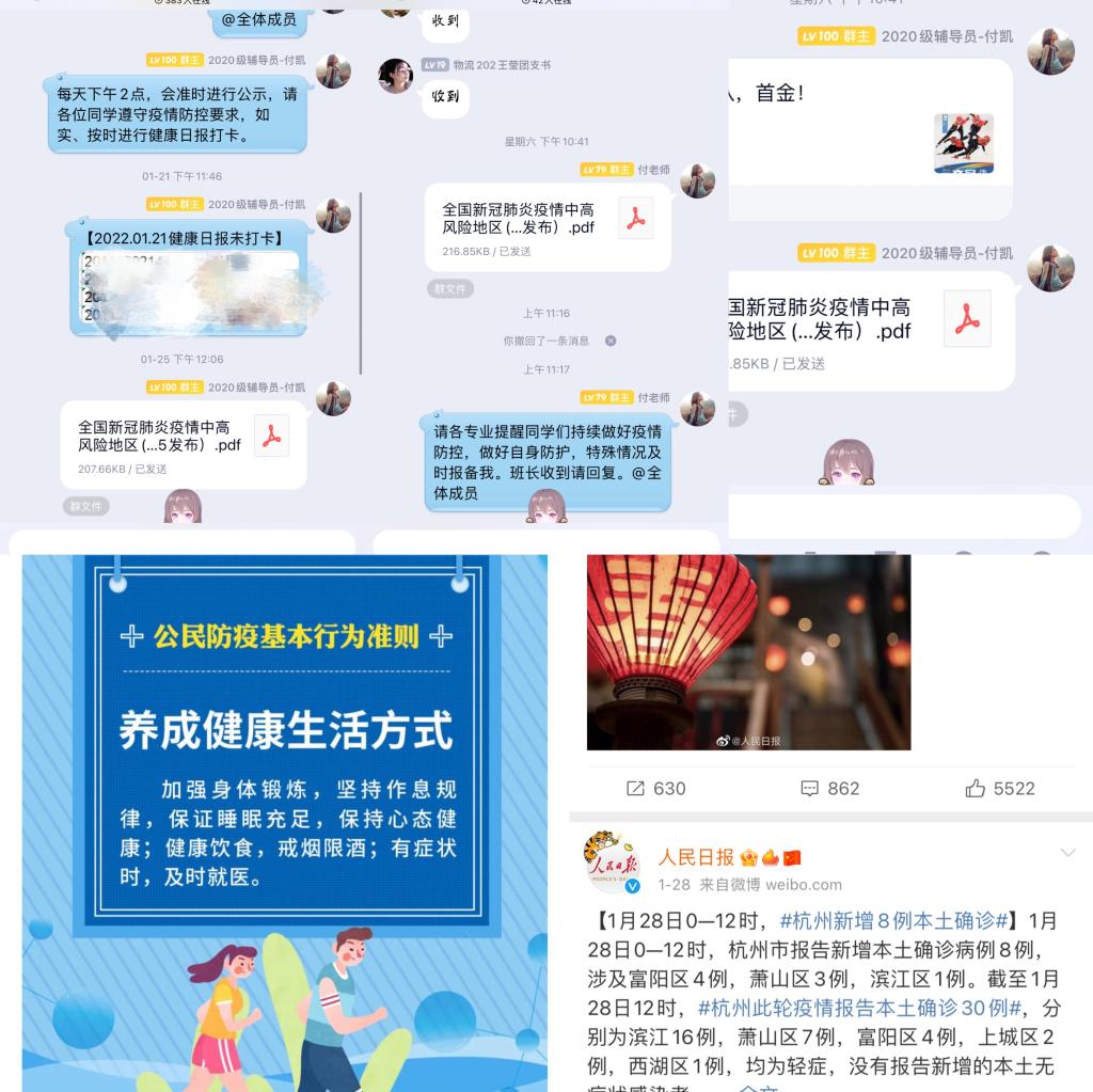 精准防控,加强防疫安全宣教。坚持“日报告”“零报告”制度,线上线下相结合,动态掌握学生健康状况。融合平台、创新载体、加强引导,全方位、多维度持续宣传伟大抗疫精神。加大正面宣传力度,宣传疫情防控形势,牢牢守住意识形态阵地,提高学生对疫情防控的思想认识。根据疫情形势变化,通过多种方式向学生讲清防疫政策和严峻形势,引导学生自觉遵守常态化疫情防控条件下的行为规范。