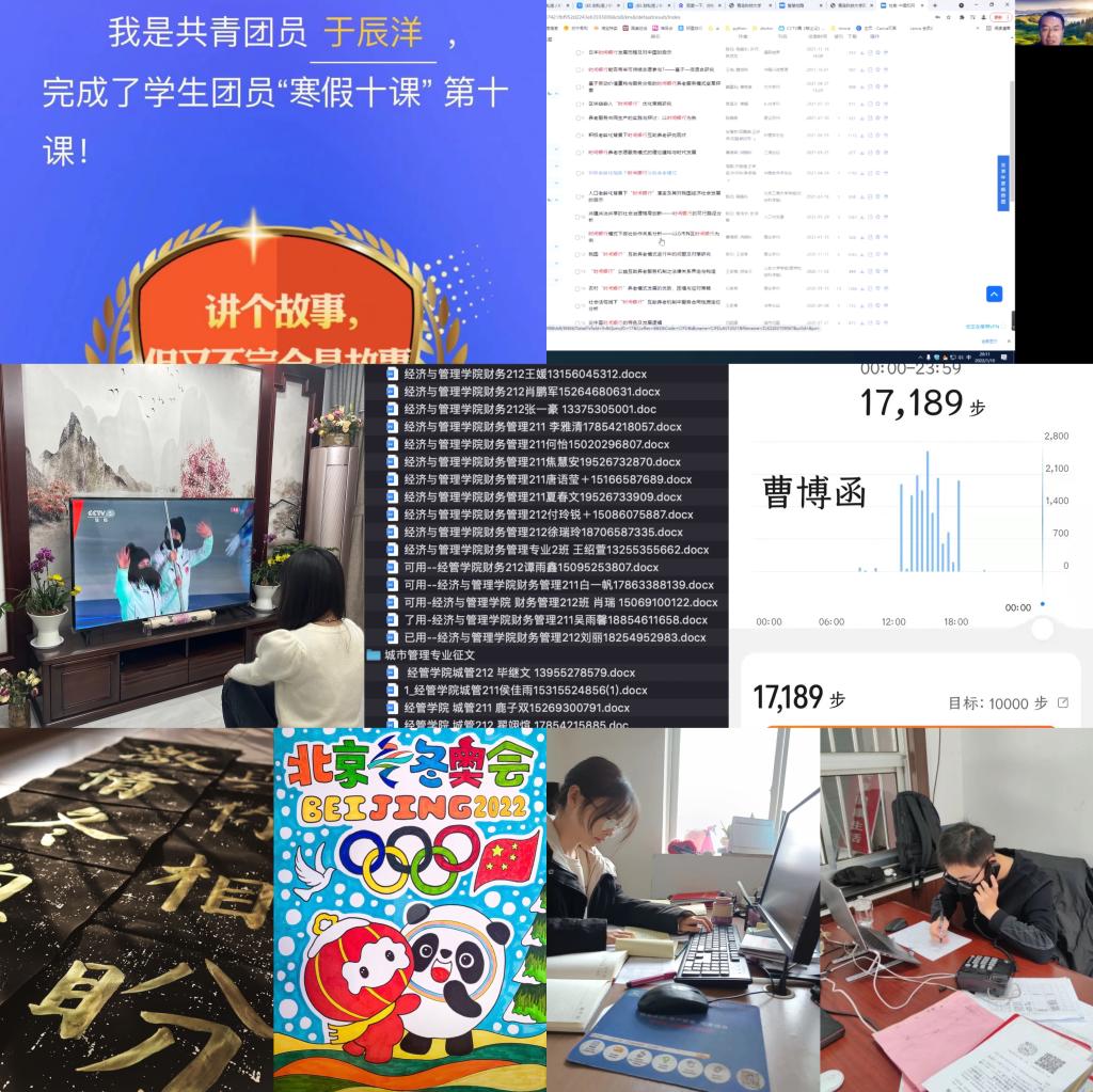 tyc1286太阳成集团持续构建“五育并举”协同育人模式,助力学生实现黄金期“弯道超车”,强化德育提升素养,组织全体学生参与“传承红色基因、争做时代新人”红色征文活动并积极投稿学校;开展“我的读书日记”读书活动,并分阶段引导学生做好读书笔记、撰写读书报告;组织学生积极开展“寒假十课”学习并跟踪进度,以主题团课的形式组织全体学生学习共青团十八届六中全会精神,组织全体学生观看冬奥会开幕式,并积极参与“迎冬奥,我来赛”网络知识竞赛,激发冬奥会等时政热点的思想政治教育功能。强化智育巩固学业,引导全体学生聚焦自身主责主业,成立专业内部学习互助组开展课程补习,利用假期时间及时查漏补缺;围绕科创竞赛全面铺开,组织全体学生积极参与科创赛事,并就学生组队、选题、指导、ppt制作、参赛经验分享及心理辅导等开展“一条龙”服务,助力学生培育科创思维。强化体育夯基固本,组织学子积极响应学校“科大与你一起ying冬奥·年”活动,利用微信运动、运动器械等开展体育运动,确保每日步数 6000 步以上、运动里程 2Km 以上、运动时长超过 40 分钟,以实际行动积极响应学校“爱体育·兴科大”号召。强化美育涵养情感,充分利用春节、冬奥会契机,组织学生积极参与“tyc1286太阳成集团首届“我和我的家乡”短视频/摄影大赛”“一起ying冬奥·年”活动,鼓励学子将情感付诸笔端与镜头,用书法、绘画、vlog视频作品等表达对春节及北京冬奥会的祝福。强化劳育淬炼意志,组织全体学生积极参与寒假社会实践,积极发挥各年级学生干部、党员骨干的先锋模范和桥梁纽带作用,围绕“青鸟计划”、“一起云支教 共同迎冬奥”专项活动等实践开展全程指导,引导学子在实践锻炼中磨练意志、增长才干。