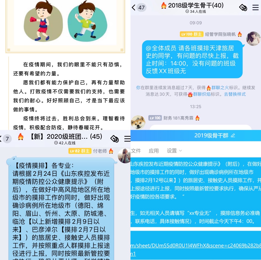 学院积极构建常态化疫情防控机制,建立“学院、年级、班级、宿舍”四级防控主体体系,织牢织密“网格化”疫情防控网。辅导员、班主任(导师)全方位联动,全面摸排、动态掌握寒假期间全体学生及共同生活的家庭成员健康状况和行程轨迹,确保每名学生返校前14天的旅居史、接触史、健康史底数清、情况明。及时根据学校通知做好重点地区疫情摸排工作并按照最新管控要求执行,确保从严从紧、科学精准落实好疫情防控各项要求。积极引导全体学生在“青科学工”平台进行累计连续14天健康打卡,如实、主动向辅导员报告健康状况和活动轨迹。通过线上主题班会、发布线上提醒、学院官微推文等方式向学生传达疫情防控知识,联防联控切实保障学生健康安全。