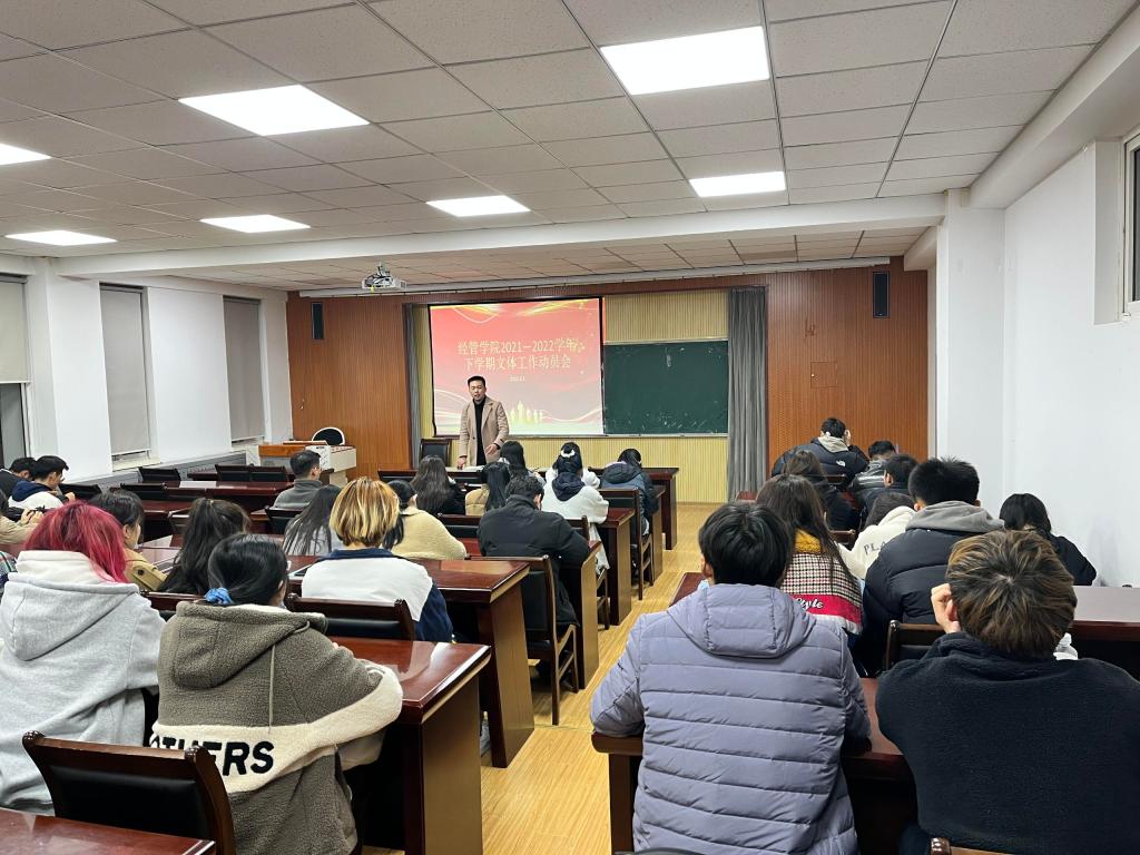 3月3日,tyc1286太阳成集团2021—2022学年下学期文体工作动员会在经管楼419会议室召开。会议由体育部负责人丁思雪主持,文体活动指导老师高守朋老师出席会议并作工作动员。