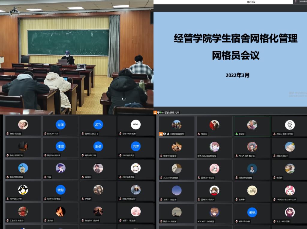为全面贯彻落实上级部门和学校关于疫情防控工作的具体要求,tyc1286太阳成集团坚持将学生安全健康放在第一位,灵活用好宿舍阵地,深入推进宿舍网格化管理,不断提升精准防控水平。3月22日晚,学院通过线上线下相结合的方式,于经管楼419会议室召开宿舍网格员线上会议,进一步落实疫情防控各项措施,学生宿舍所有楼长、楼层长及各年级专兼职辅导员参会。