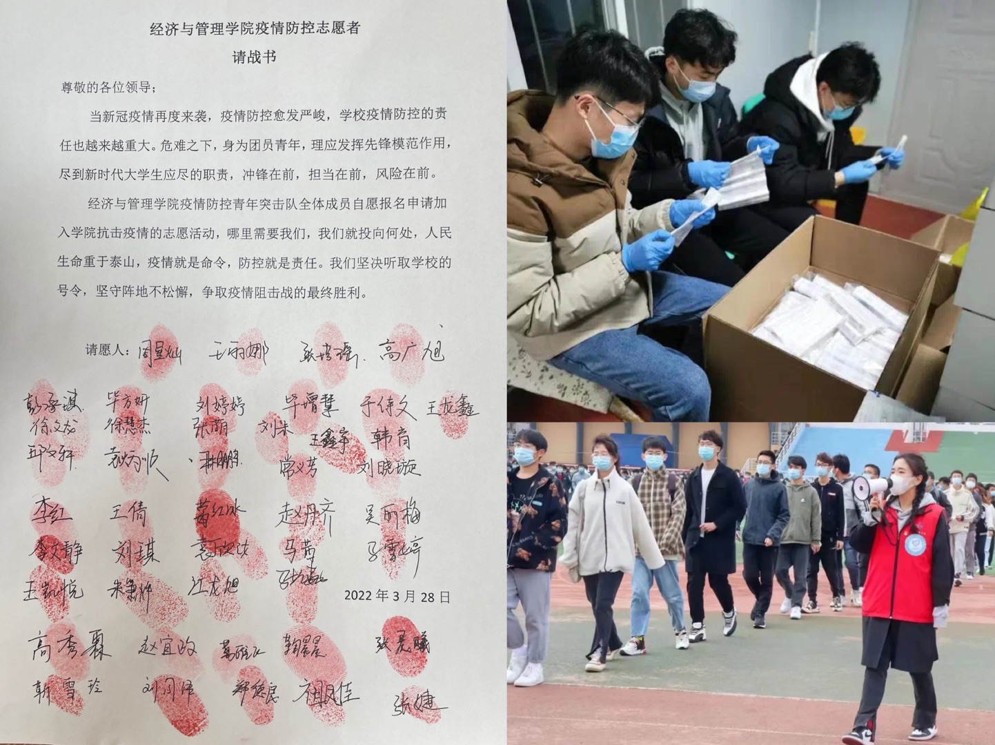 在疫情防控攻坚战的关键时刻,tyc1286太阳成集团面向全体党员发出号召,到防疫一线最需要的地方去。一时间,学生党支部书记、辅导员的QQ和微信消息被瞬间填满,tyc1286太阳成集团全体党员纷纷提交“请战宣言”:“我们要请战,因为我们是党员,关键时刻就该挺身而出”,“如果可以,请把我安排在后半夜,我是男生,绝对没问题!”这是党员们的声音,他们是这么说的,也是这么做的。这些党员里,有即将奔赴西部进行支教的毕业生,有刚刚助力团队完成挑战杯国赛答辩,“才下战场又上一线”的“国奖”获得者,有刚刚成为预备党员,全力希望实现个人价值的大三学生...他们真情提交“”,并郑重签上名字,按上手印。当前,学生党员已纷纷加入到学校疫情防控志愿服务工作中来,全力配合学校做好疫情防控工作。