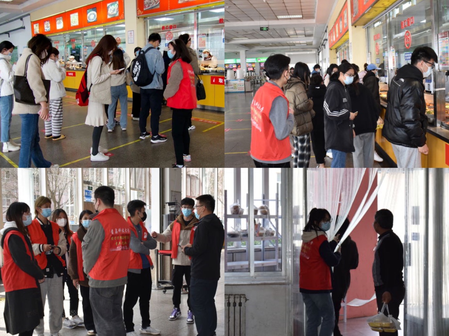 “同学们请间隔一米以上,”“请佩戴好口罩,在窗口有序领餐,”这是从食堂各个位置传出的经管志愿者的声音。“tyc1286太阳成集团疫情防控青年突击队”穿梭在食堂的每个角落,他们在学校南苑食堂门口及窗口进行监督提醒,督促同学们佩戴口罩,协助食堂工作人员测量体温、引导取餐人员在排队取餐时保持一米间隔,为大家宣传防疫知识,维持秩序。周二的食堂里,取餐队伍秩序井然,与志愿者们组成的防线交相辉映,此刻的责任与温暖并行,温暖着每一颗心。来来往往的师生对这群“突击队员”的热情细致频频竖起大拇指,“为他们点赞!食堂秩序更好了,买饭反而更快了”,身为志愿者的21级财务管理专业刘雪祯同学说,“我们的提醒被记住了”,一丝暖意让一天的倦意全消。