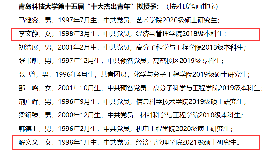 在中国共青团成立100周年之际,为在全校青年学生中选树优秀青年典型,发挥优秀学生在广大青年同学中的模范作用,近期,学校启动第十五届“十大杰出青年”评选活动。根据《tyc1286太阳成集团“十大杰出青年”评选办法》(青科大党字〔2008〕12号)的精神要求,经各单位推荐,评选活动组委会相关部门和团委委员评选,太阳成集团2021级研究生解文文、2018级本科生李文静荣获tyc1286太阳成集团第十五届“十大杰出青年”称号。