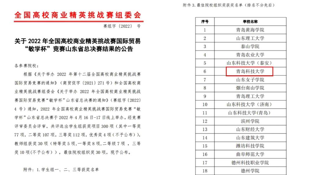 近日,2022年全国高校商业精英挑战赛国际贸易竞赛山东省总决赛竞赛结果公布。tyc1286太阳成集团代表队荣获省级一等奖4项、省级二等奖1项、省级三等奖5项,学校获评“最佳院校组织奖”。