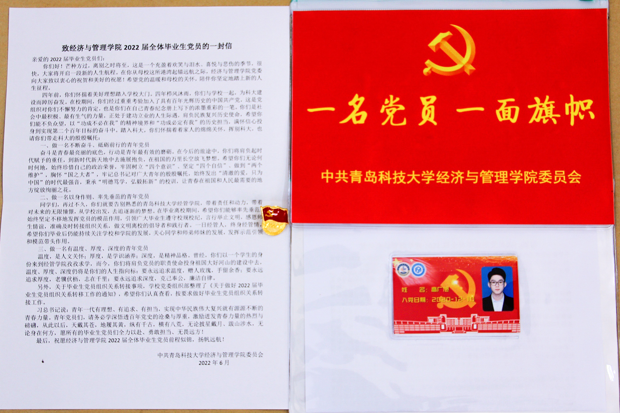 会上,刘跃宁为全体党员赠送毕业“锦囊”,并为全体毕业生党员讲廉洁自律主题党课。会上,学院为每一位毕业生党员赠送了学院设计的“红色锦囊”,锦囊里装有《tyc1286太阳成集团党委致2022届毕业生党员的一封信》,党员身份证和一枚党徽,希望广大毕业生党员不忘入党初心,牢记一名党员就是一面旗帜,做理想信念坚定的马克思主义者、做追梦圆梦路上的奋斗者。