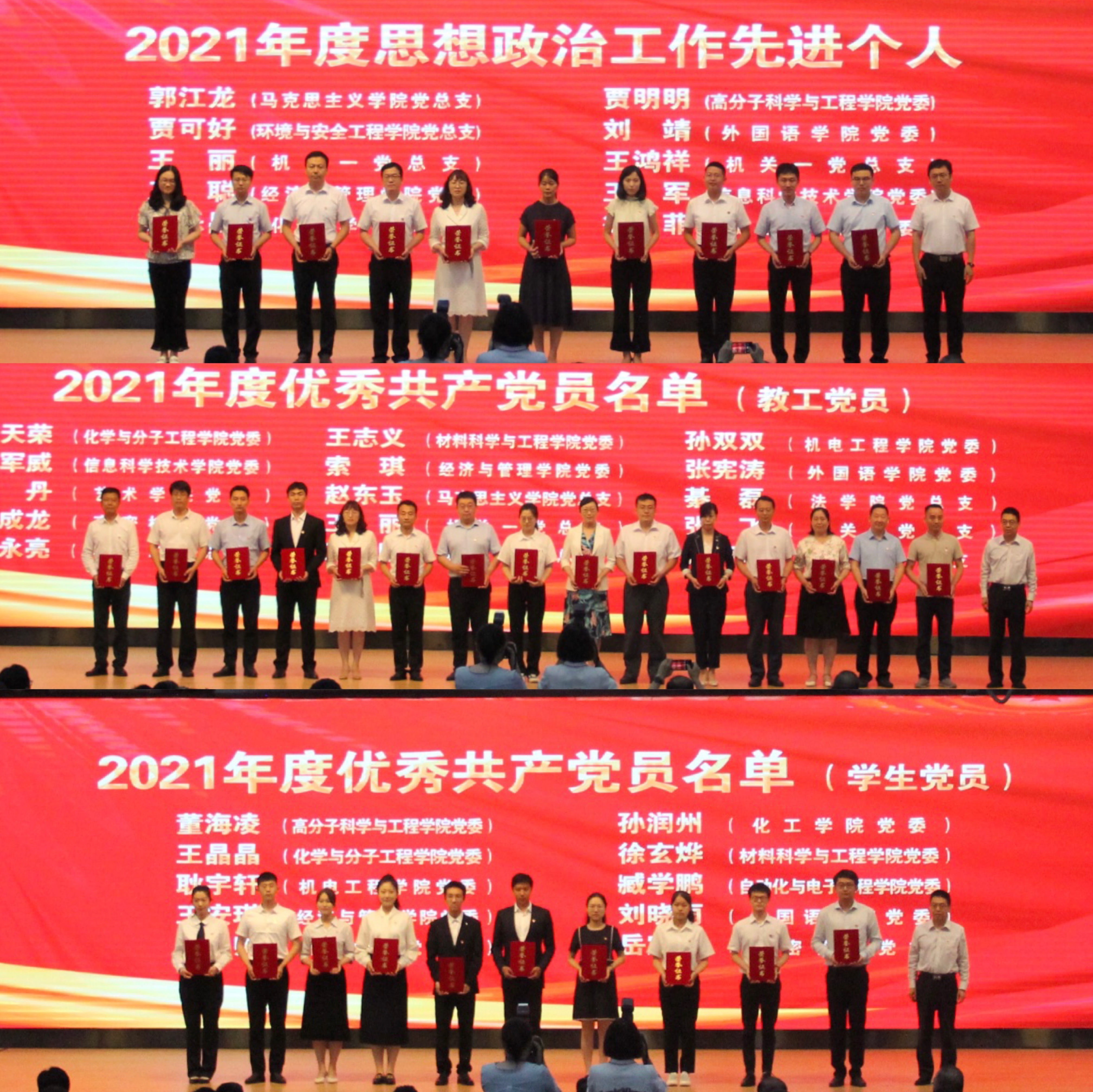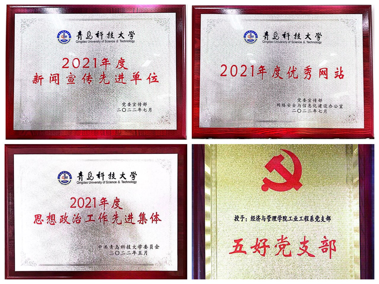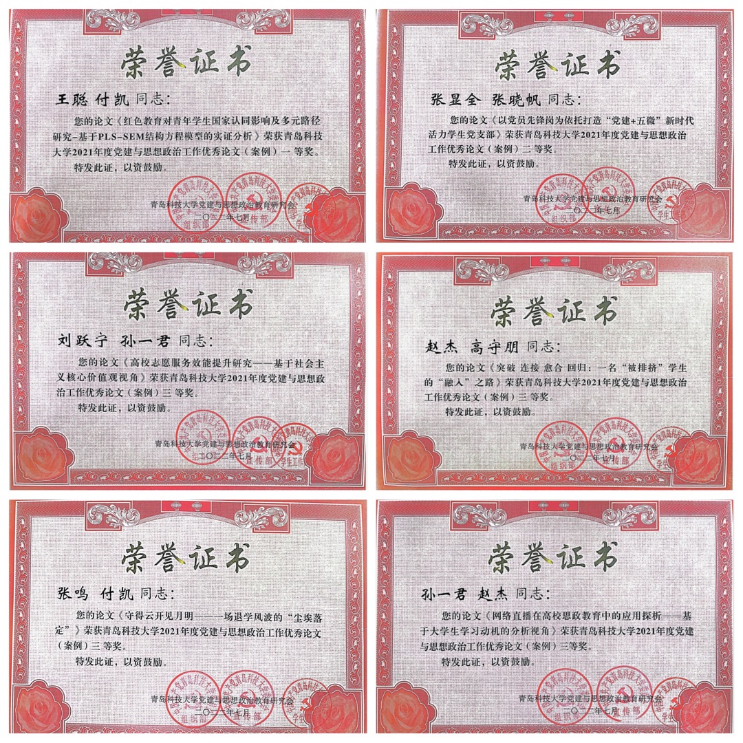会议表彰了2021年度思想政治工作先进集体、思想政治工作先进个人、优秀共产党员、优秀党务工作者、“五好”党支部等获奖集体和个人,其中,学院获2021年度新闻宣传先进单位、2021年度优秀网站,工业工程系党支部获思想政治工作先进集体、“五好”党支部,王聪获思想政治工作先进个人,索琪、王安琪(学生)获优秀共产党员。王聪、付凯撰写的论文《红色教育对青年学生国家认同影响及多元路径研究-基于PLS-SEM结构方程模型的实证分析》获优秀论文(案例)一等奖,张显全、张晓帆撰写的案例《以党员先锋岗为依托打造“党建+五微”新时代活力学生党支部》获二等奖,刘跃宁、孙一君撰写的论文《高校志愿服务效能提升研究——基于社会主义核心价值观视角》、赵杰、高守朋撰写的案例《突破 连接 愈合 回归:一名“被排挤”学生的“融入”之路》、张鸣、付凯撰写的案例《守得云开见月明——一场退学风波的“尘埃落定”》、孙一君、赵杰撰写的论文《网络直播在高校思政教育中的应用探析——基于大学生学习动机的分析视角》获三等奖。学院新媒体项目获评“最佳原创微信推文”,张鸣获2021年度新闻宣传先进个人。
