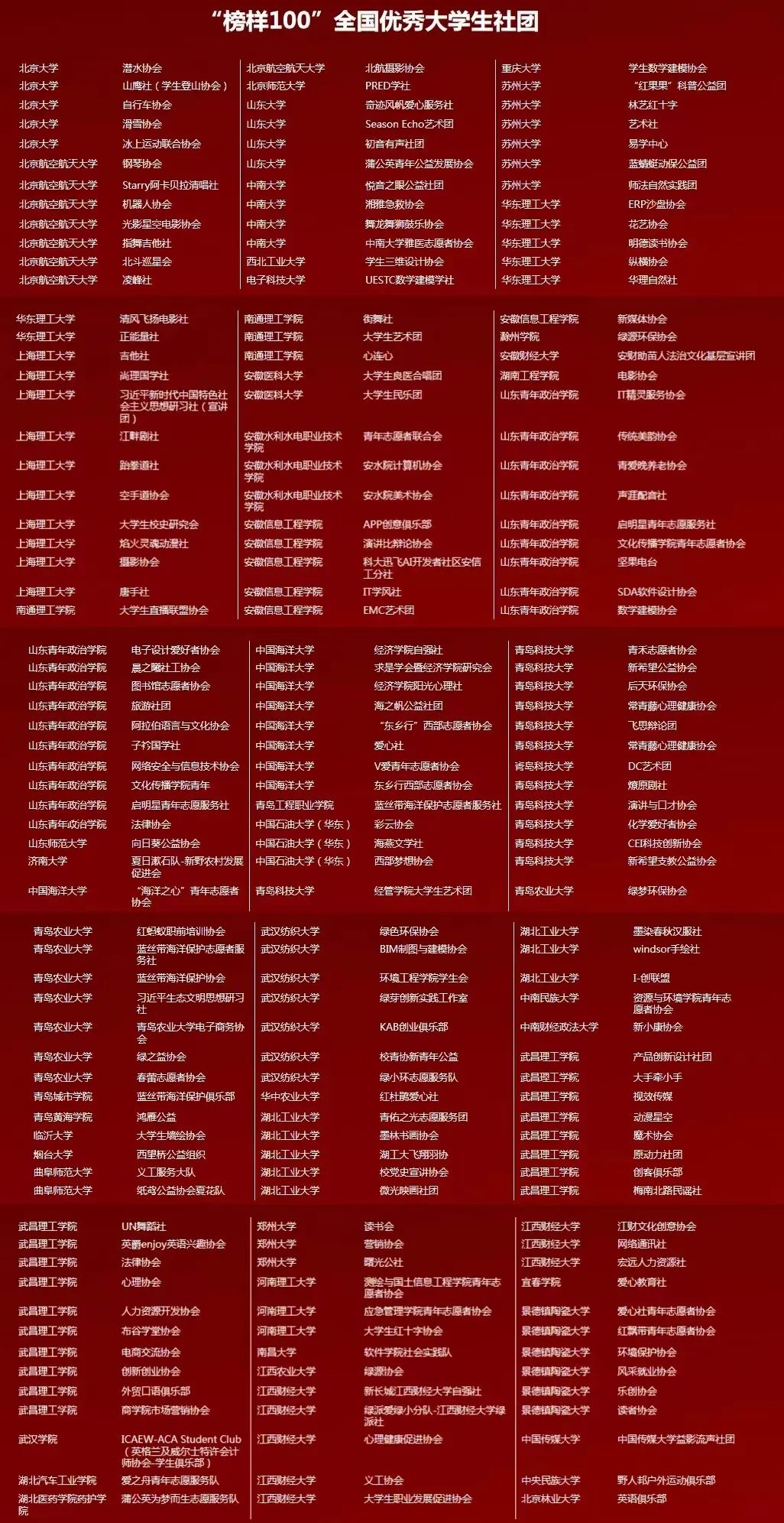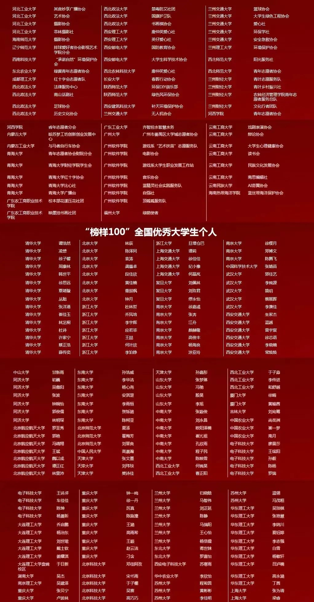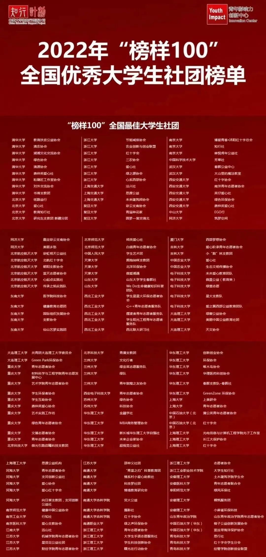 12月14日,中国大学生知行计划公布2022年“榜样100”全国优秀大学生社团榜单,tyc1286太阳成集团创新创业联盟、暖心愿公益团队入围“榜样100”全国最佳大学生社团,tyc1286太阳成集团大学生艺术团入围“榜样100”全国优秀大学生社团,李婕、李晓菲获全国优秀大学生个人。