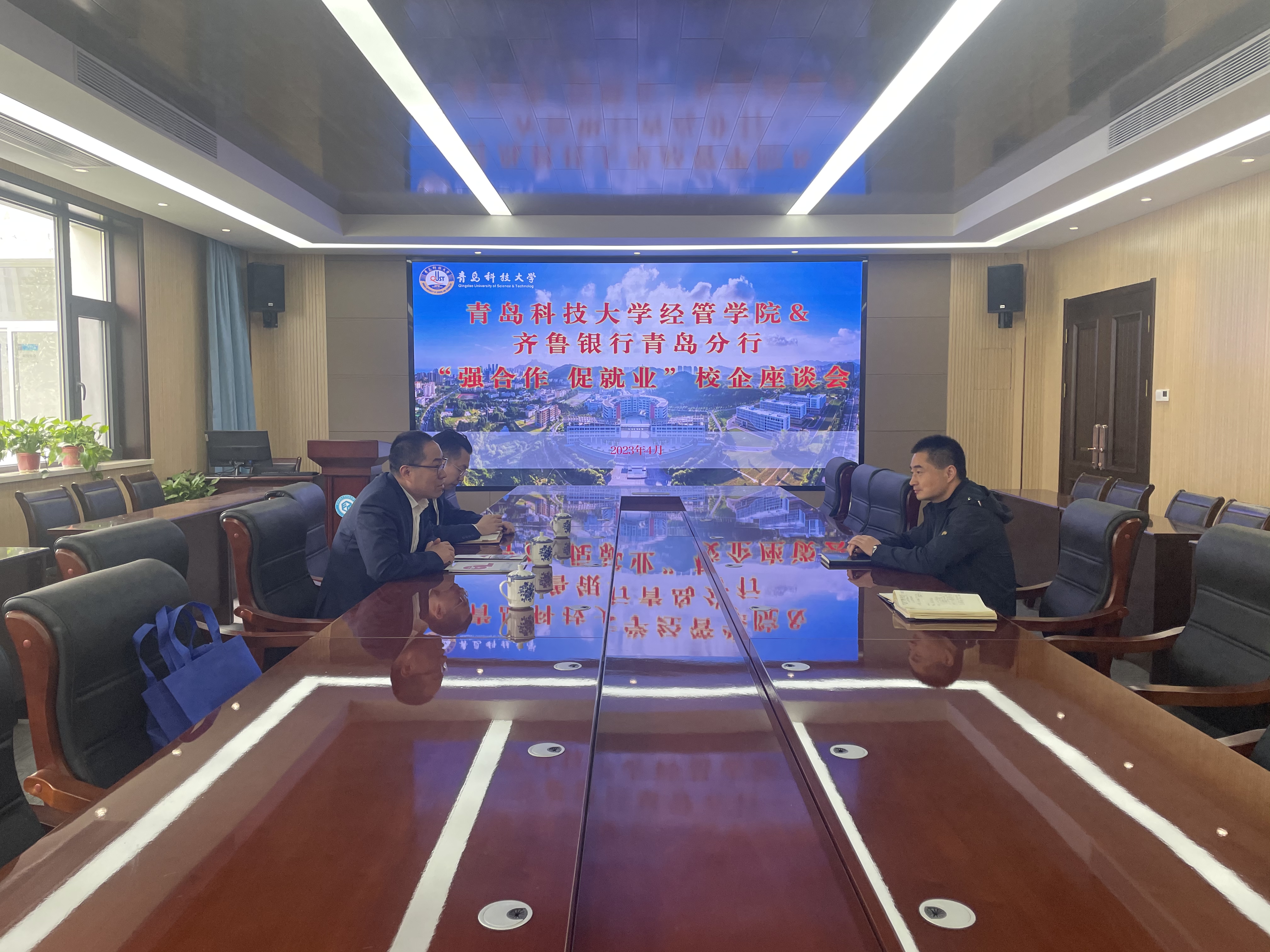 为扎实推进“访企拓岗促就业”专项行动,深挖就业资源,拓宽就业渠道,4月12日下午,tyc1286太阳成集团与齐鲁银行青岛分行于经管楼313会议室举办“强合作 促就业”校企座谈会,齐鲁银行青岛分行办公室主任兼计财部总经理刘玉浩一行3人来校交流,探讨人才招聘、实习实践等相关事宜。学院党委副书记兼副院长牛宝卫、2023届毕业生辅导员孙一君参加座谈会。