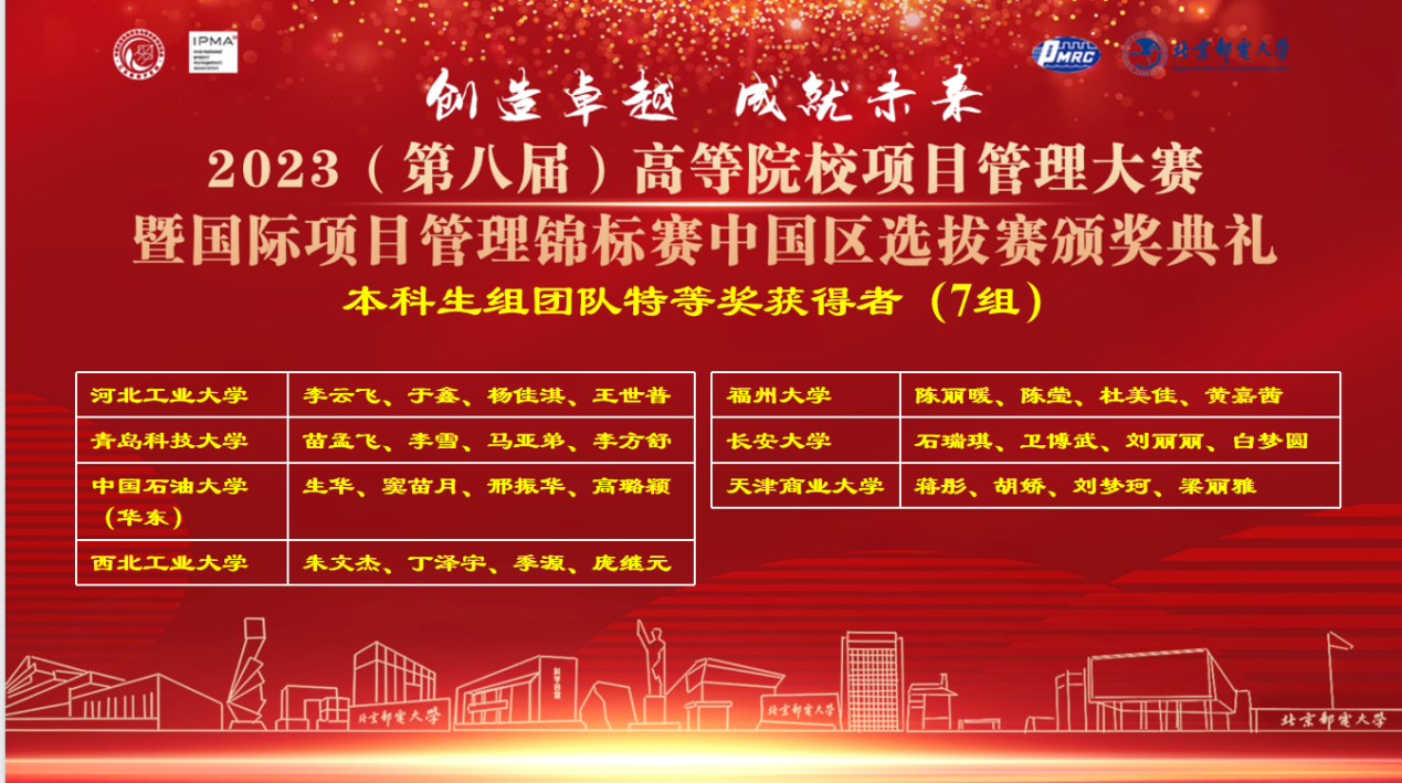 2023年6月3日,第八届全国高等院校项目管理大赛在北京邮电大学落下帷幕。大赛由中国优选法统筹法与经济数学研究会、国际项目管理协会(IPMA)主办,北京邮电大学、中国青年项目管理者俱乐部(CYC)承办,上海普华科技发展股份有限公司和西安华鼎项目管理咨询有限责任公司协办。