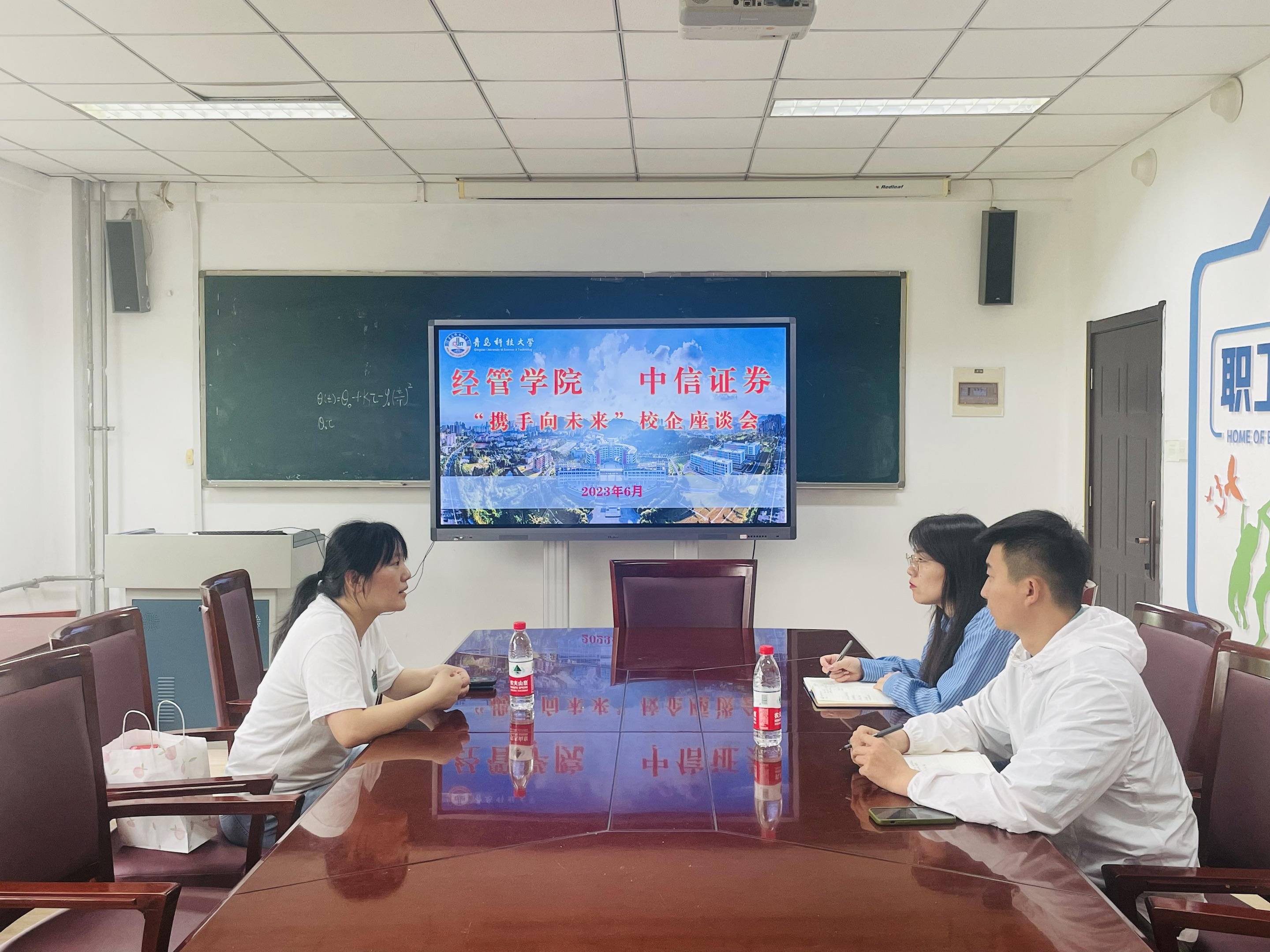 为扎实推进“访企拓岗促就业”专项行动,深挖就业资源,拓宽就业渠道,6月7日上午,tyc1286太阳成集团与中信证券于经管楼415会议室举办“携手向未来”校企座谈会,中信证券统一客户联络中心许娜经理来校交流,探讨人才招聘、实习合作等相关事宜。学院2024届毕业生辅导员付凯、袁绍正参加座谈会。