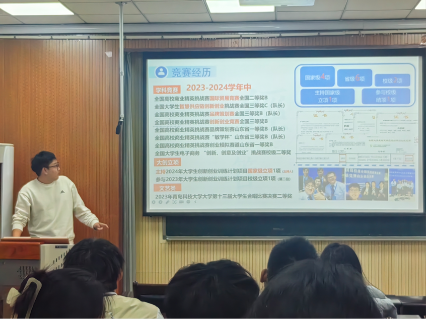 耿斯瑞以诙谐幽默的语言风格打破距离感,向同学们毫无保留地分享竞赛经验,传授获取竞赛信息的窍门。告诉同学们一份逻辑严谨、内容详实的的策划文件,搭配重点突出的ppt和完备的答辩材料,是成功的关键。