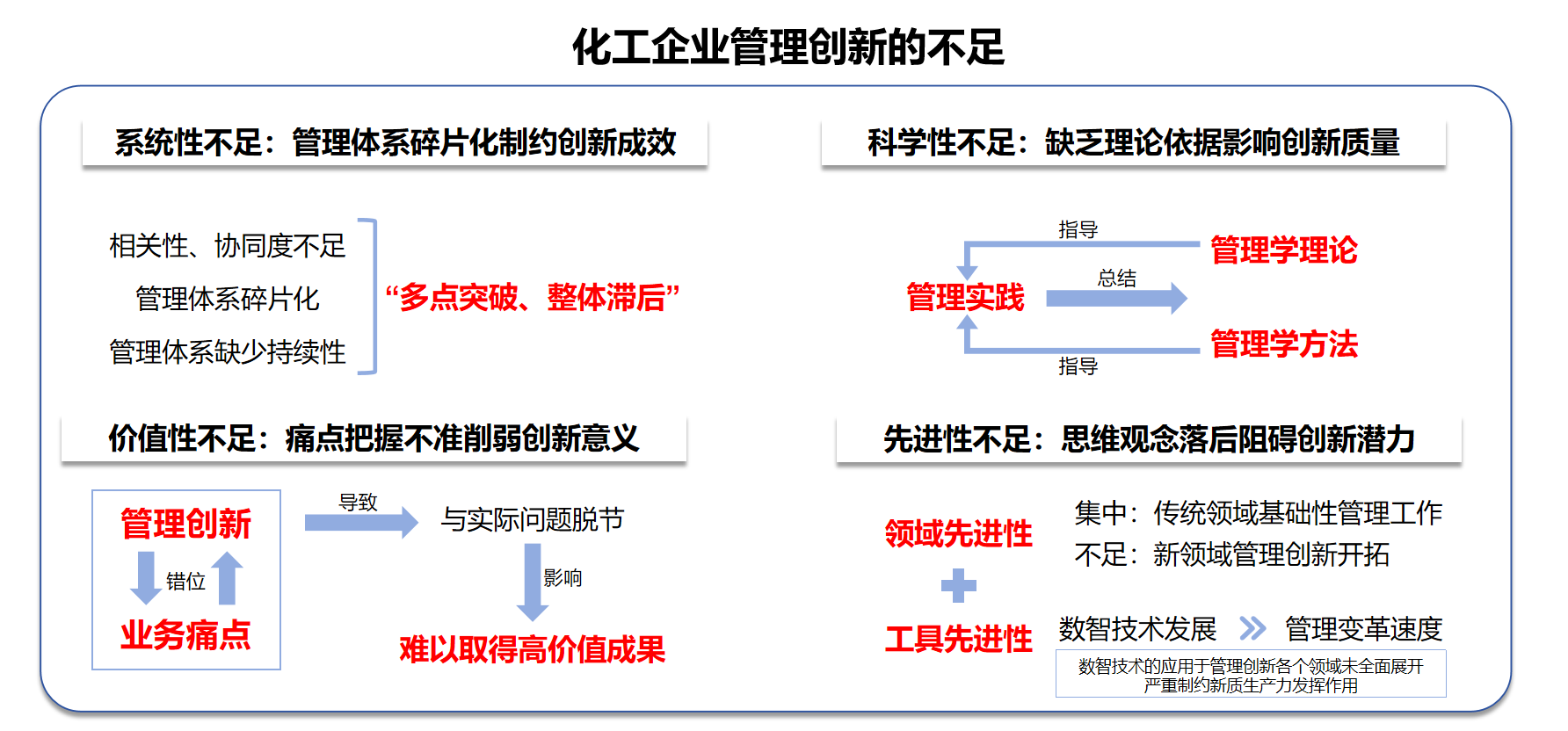研究团队指出,当前我国化工行业正处于"双碳"战略转型与数字化转型的关键交汇期,管理创新已成为发展新质生产力的核心动能。但在实践推进中,仍存在四大突出短板亟待破解: