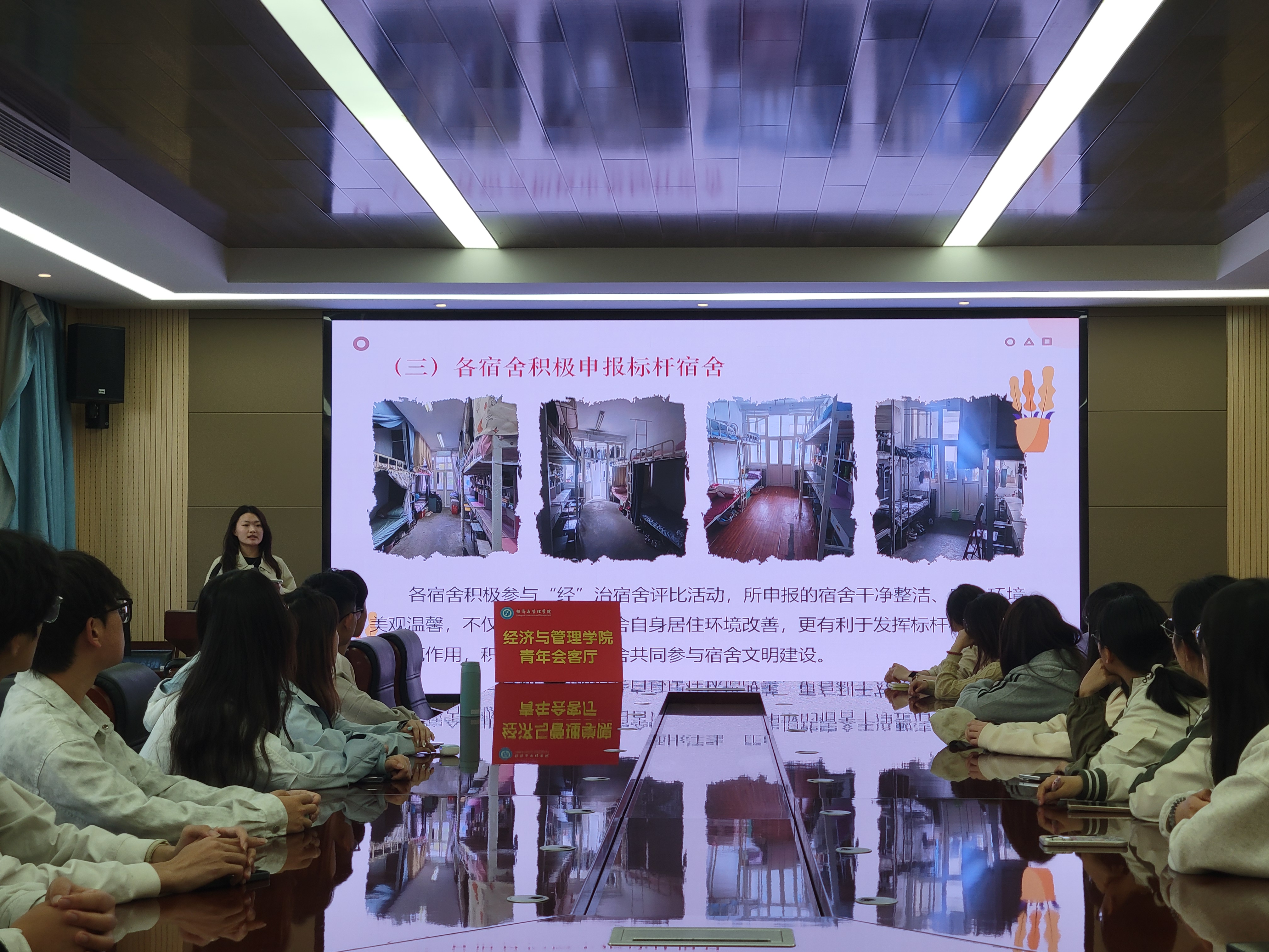 活动伊始,权益部负责人武芳竹围绕近期宿舍建设工作进行了全面总结。目前,学院将宿舍文明建设作为重点任务进行开展,围绕日前发布的“1234N‘经’治宿舍”建设计划和学生成长“共同体”实施方案落实实施。
