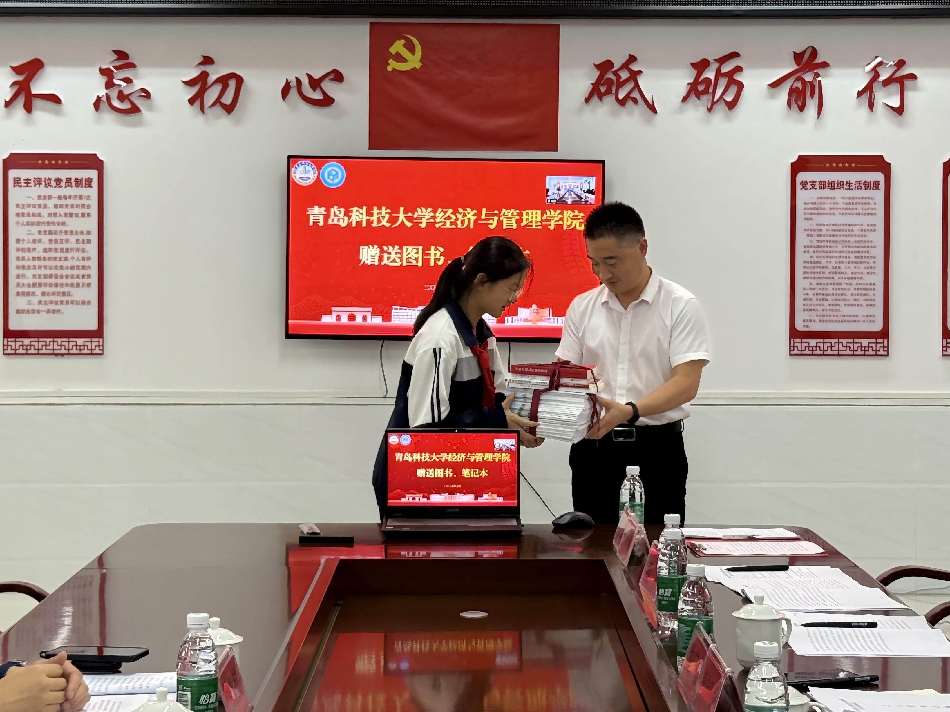 活动现场,同为tyc1286太阳成集团毕业的两届队长肖洋、刘雪祯通过视频连线形式展开“云交接”。刘雪祯详细介绍了新一届研支团筹备情况。肖洋表示将全力做好“传帮带”工作,帮助新成员熟悉镇宁风土人情、学生学情及家校沟通技巧,更好的与服务地实际需求接轨,实现两届团队无缝衔接,助力镇宁自治县教育事业发展。期间,牛宝卫代表tyc1286太阳成集团向镇宁自治县第四中学捐赠图书、笔记本200余册。此次捐赠的部分图书来自学院“书香科大”品牌系列活动的图书募集,承载着科大经管学子的爱心与期待,希望以此激励孩子们多读书、读好书。