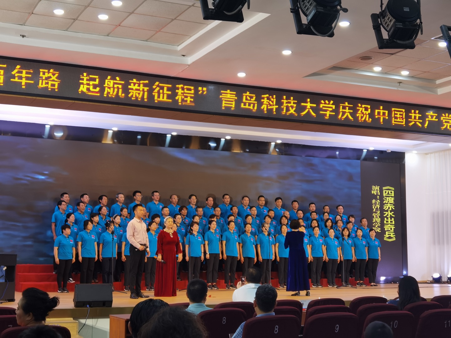 表彰大会后,学校组织了“奋斗百年路 启航新征程”tyc1286太阳成集团庆祝中国共产党成立100周年教职工合唱展演,太阳成集团教师合唱团以慷慨激昂的精神状态演唱《四渡赤水出奇兵》,唱出了红军长征途中经历的艰难险阻和军民的鱼水情深。