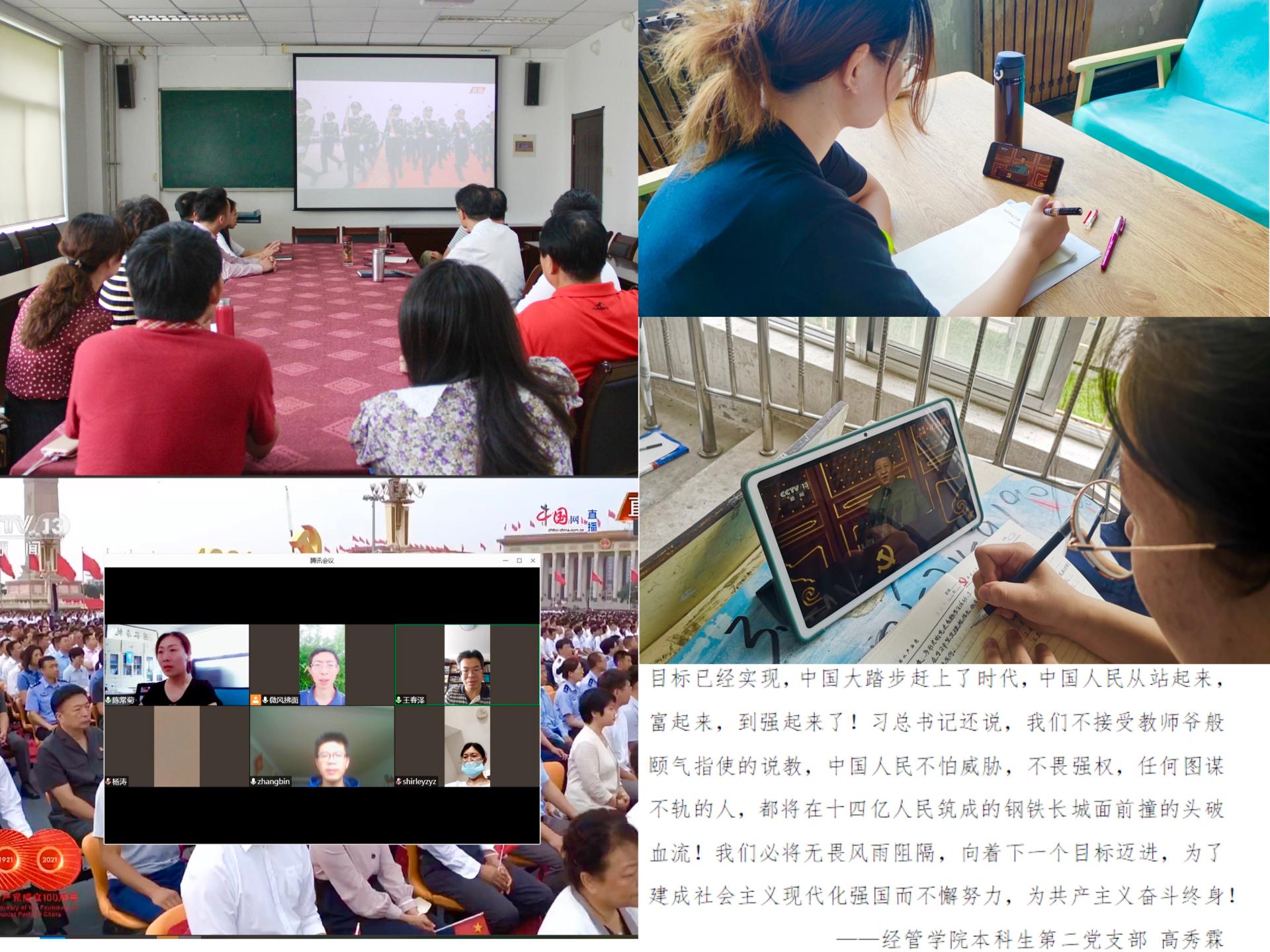 集中观看一次大会,齐奋进、鼓人心。7月1日上午,庆祝中国共产党成立100周年大会在北京天安门广场隆重举行。中共中央总书记、国家主席、中央军委主席习近平发表重要讲话。tyc1286太阳成集团党委理论学习中心组、师生党员及广大团员以主会场与分会场相结合、集中学习与个人自学相结合的形式,多途径、多渠道收看大会盛况,并结合自身学习工作实际书写心得感想,向党向国表初心、话使命。全体师生表示,要切实将内心的赤诚与感动化为前进的动力源泉,听党的话,跟党走,立志高远,不畏艰难,鼓起勇气承担起时代责任。
