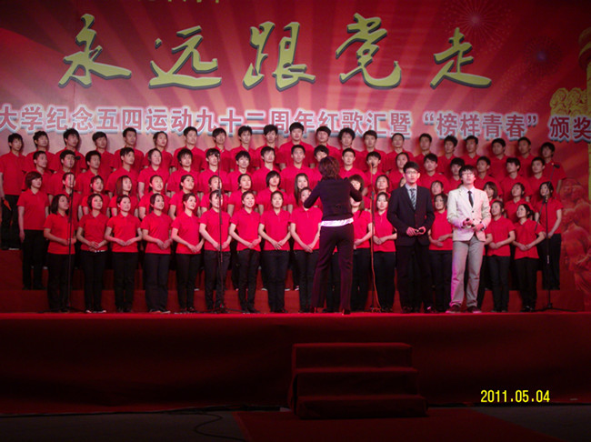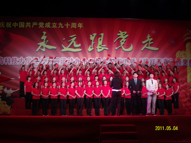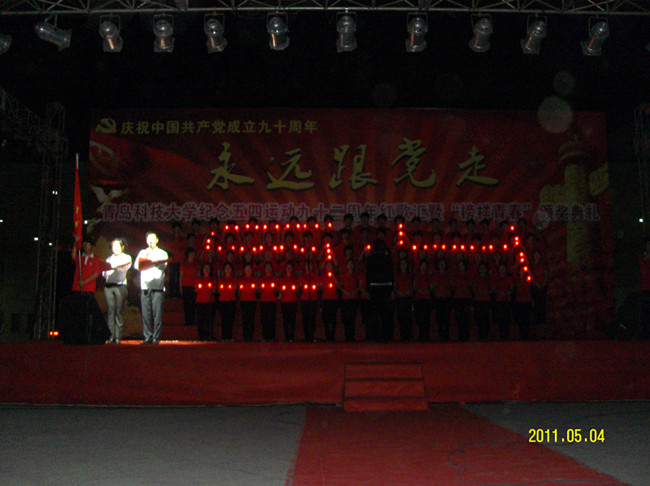 为纪念五四运动92周年以及中国共产党建党90周年,我校于5月4日晚在崂山校区明德广场举办了“永远跟党走”五四红歌汇暨“榜样青春”颁奖典礼。