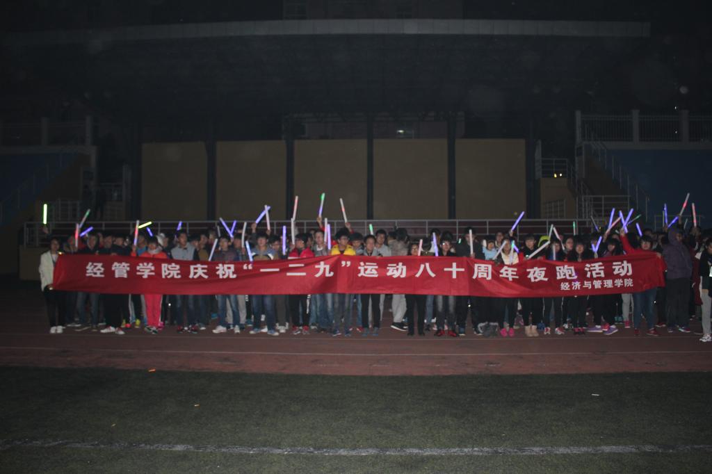 为纪念一二九爱国运动80周年,激发广大学生的爱国热情,同时响应“三走”主题群众性课外体育锻炼活动号召,11月29日晚,tyc1286太阳成集团于南苑操场组织开展纪念“一二九”运动八十周年夜跑活动,近二百名学生准时到达集合地点,依次领取了荧光棒、指灯等装备共同参与了此次活动。