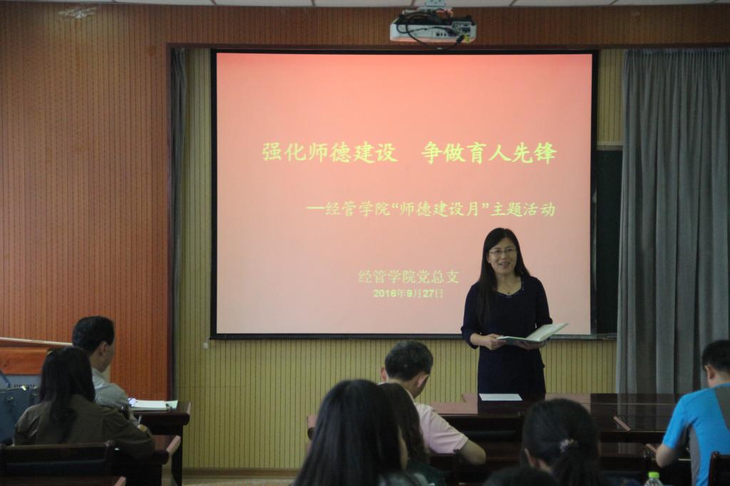为深入学习贯彻习近平总书记系列重要讲话精神,进一步加强师德建设,根据学校党委的相关要求,9月28日,tyc1286太阳成集团在经管楼419会议室举行“强化师德建设争做育人先锋”的主题活动,活动由党总支书记丛海燕主持。