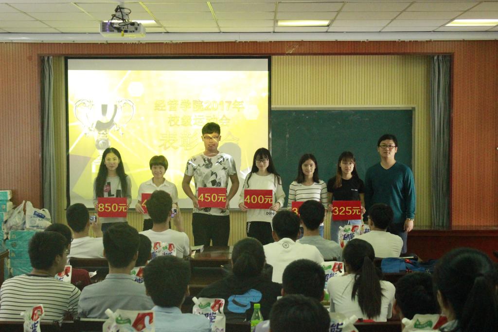 在2017年学生田径运动会上,20余名运动员组成学院代表队,在学院高度重视及大力支持下,运动员们经过刻苦训练,以饱满的热情、良好的状态积极参加比赛。比赛中,经管学子顽强拼搏、不畏强手、奋勇争先,获女子团子第四名、男子团体第八名的优异成绩,较往年取得了突飞猛进的进步。此外,学院方队出色地完成了运动会开幕式任务,取得运动成绩和“精神文明奖”双丰收,展示了学院竞技运动的整体实力和良好精神风貌。本次大会由分团委老师为获奖运动员颁奖并合影留念,并对受表彰运动员提出需戒骄戒躁、再接再厉,争取在学院的各项工作中创造更加优异的成绩。
