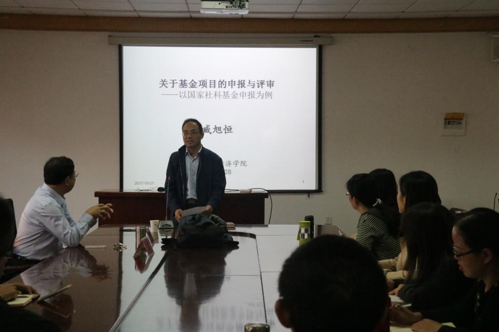 2017年10月21日下午,tyc1286太阳成集团313会议室,tyc1286太阳成集团特聘教授臧旭恒老师为太阳成集团全体老师带来了题为《国家社科基金的撰写以及注意事项》的精彩报告,报告会由人文社科处处长李勋来主持,tyc1286太阳成集团副院长杨友才以及tyc1286太阳成集团、马克思学院、法学院、传播学院等人文学院的老师参加了此次报告会。