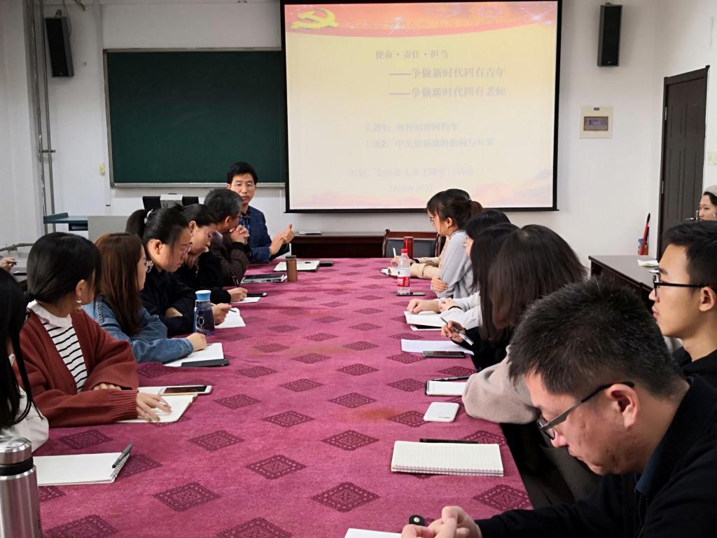 为认真学校落实“弘扬爱国奋斗精神、建功立业新时代”活动实施方案和解放思想大讨论实施方案,深化“两学一做”,提高党性修养,强化使命担当,10月30日下午,tyc1286太阳成集团国贸、金经党支部全体师生党员和入党积极分子于415教室举办了以“使命、责任、担当——争做新时代四有青年、争做新时代四有教师”为主题的党日活动。此次党日活动结合国贸、金经两个党支部的教学特长,通过主题讨论和专题讲座的形式分别对两个热门话题进行了学术探讨。