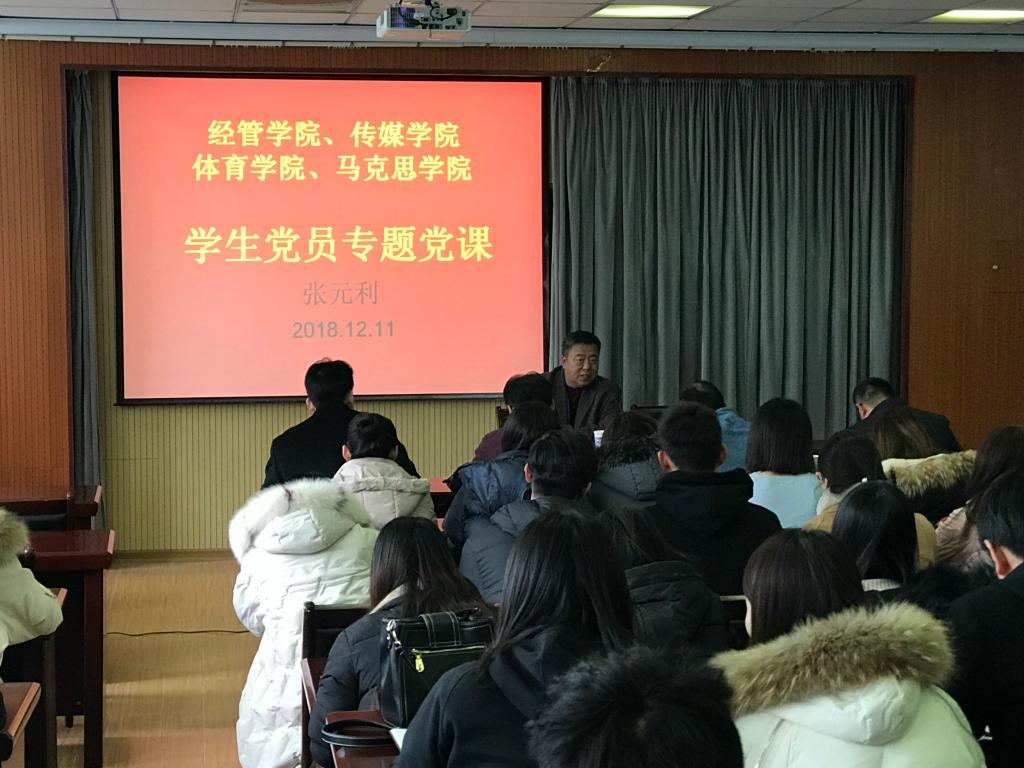 12月11日下午,在崂山校区南区2号楼tyc1286太阳成集团419会议室,学校党委副书记张元利以“改革开放四十年”为题讲授专题党课,tyc1286太阳成集团、传媒学院、马克思主义学院、体育学院党总支书记、专兼职辅导员、学生党员100余人参加党课学习。