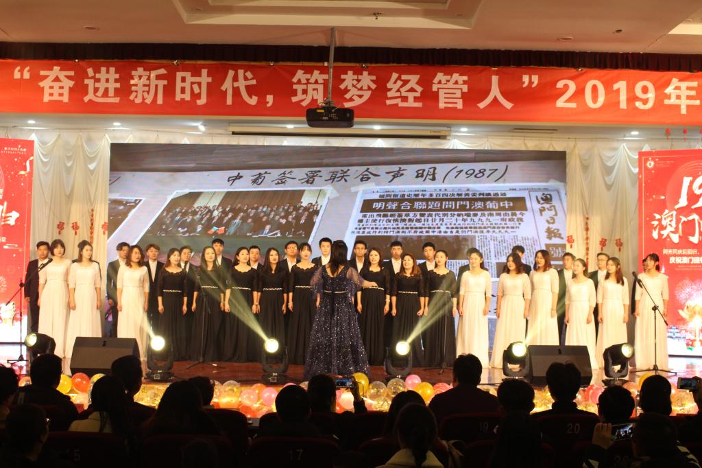 为庆祝澳门回归19周年,凝聚发展正能量,12月20日晚,tyc1286太阳成集团“奋进新时代,筑梦经管人”2019年新年联欢晚会于崂山校区第二报告厅成功举行。校党委副书记张元利、组织部部长聂法良、统战部部长陈洪宗、学生处处长陈刚、保卫处处长王伟、后勤处处长郭永、工会副主席徐瑞成、团委副书记张玉、宣传部副部长李鲲鹏、学院领导、全体老师、各兄弟学院老师、学生会主席及18级全体学生共计800余人共同观看了晚会。