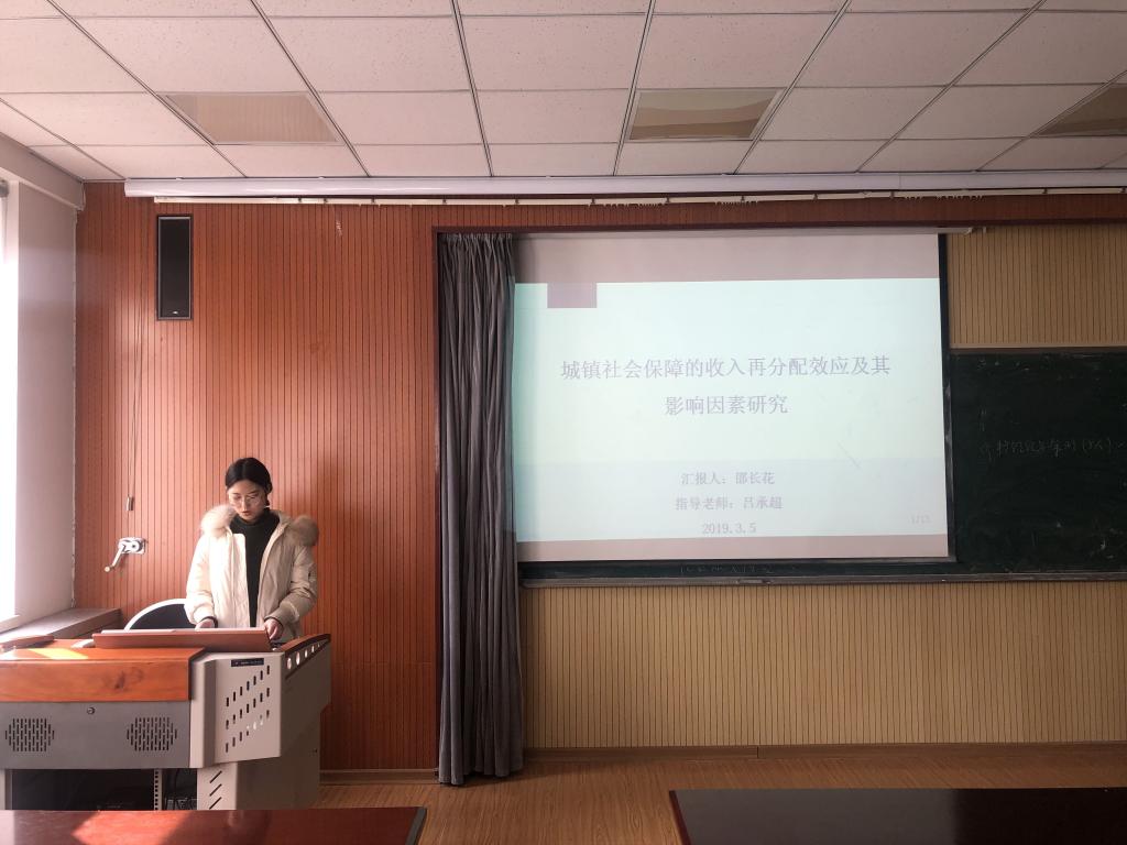 论坛开始,2018级研究生邵长花向在座师生汇报了题为《城镇社会保障的收入再分配效应及其影响因素研究》的论文,该论文利用UL模型测度了城镇社会保障的收入再分配效应,将收入再分配效应分解为横向效应、纵向效应和再排序效应,进一步通过构建计量模型探寻城镇社会保障收入再分配效应的影响因素,最终结合论文得出的计量结果提出合理的政策建议。随后,教师代表吕承超和陈阳两位老师对该论文做了精彩的点评,并提出了合理的修改建议。