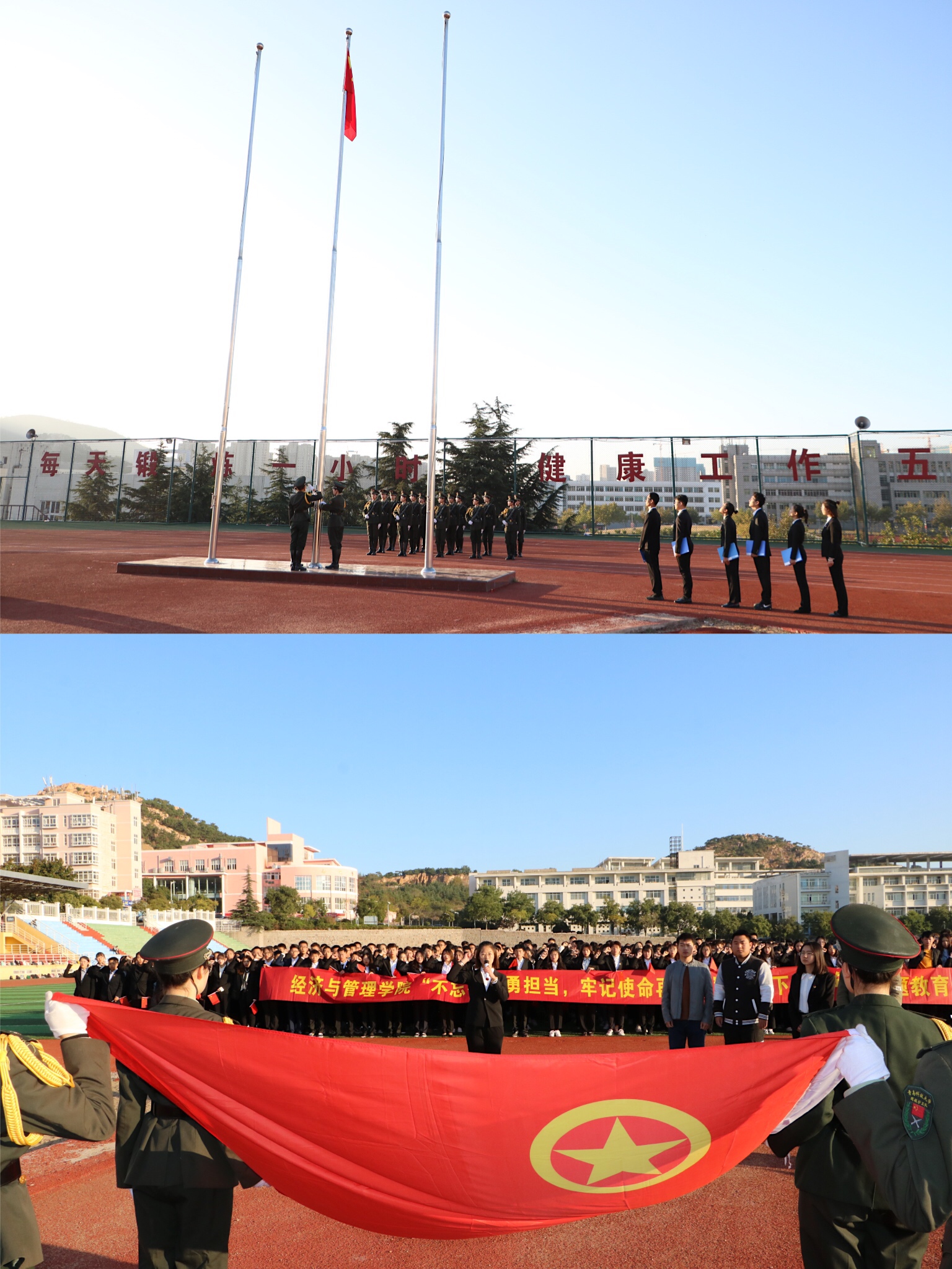 随后,全体师生面向国旗,高唱国歌,激发出经管学子接过时代接力棒、砥砺前行勇担当的无限热情。优秀学生代表、第34届学生会副主席肖映彤作了国旗下的演讲。他表示:“为了民族的复兴、国家的富强,我们要弘扬时代新思想,勇做时代弄潮儿。”接下来,由优秀学生邢筠秋、高煜婷、周志行、赵宜政朗诵了经典现代诗《我的祖国》,抒发了青年学生对祖国壮丽山河的无限赞美和建功立业新时代的精神风貌。学生会主席左靖雯作为领誓人带领全体学生面向团旗重温入团誓词,用青春梦激扬中国梦,让爱国情化为报国行。最后,全体学生在主题教育横幅上签字并留下对伟大祖国的美好祝福,以青春的名义共赴时代之约。