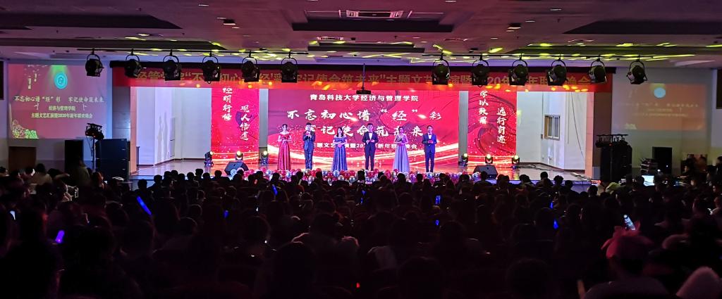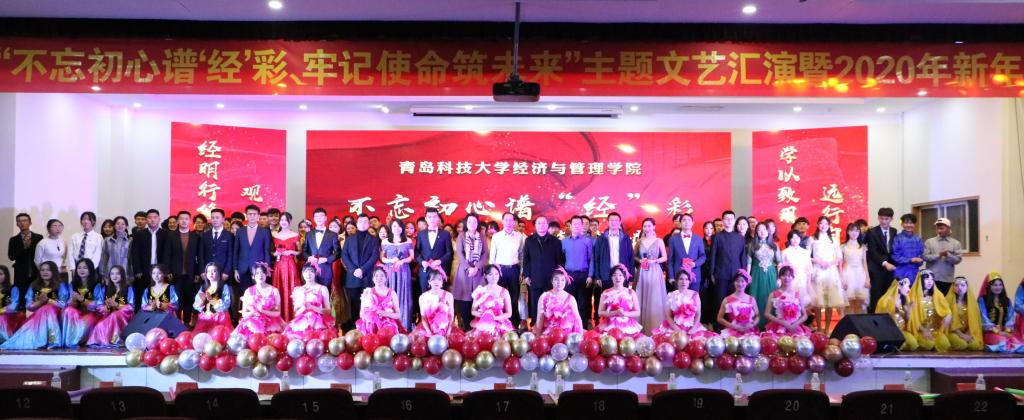 为欢庆新年、喜迎新生、歌颂伟大新时代,营造学院良好的文化氛围,同时全面总结展示学院“不忘初心、牢记使命”主题教育成果,12月12日晚,tyc1286太阳成集团“不忘初心谱‘经’彩,牢记使命筑未来”主题文艺汇演暨2020年新年联欢晚会于崂山校区第二报告厅成功举行。党委常委、副校长丁林老师,学生工作处处长、创新创业学院执行院长陈刚老师,校工会主席郭曰铎老师,教务处副处长尚猛老师,保卫处副处长严增兴老师,图书馆副馆长刘俊杰老师,校团委副书记张玉老师,tyc1286太阳成集团院长王志宪老师、副院长董华老师、副院长杨友才老师、党总支副书记兼副院长刘跃宁老师,各兄弟学院学工办、分团委、学生会、研究生会的同仁们,及太阳成集团全体师生共同观看了晚会。本场晚会共分为“初心谱‘经’彩”、“使命筑未来”、“扬帆新时代”三个篇章。