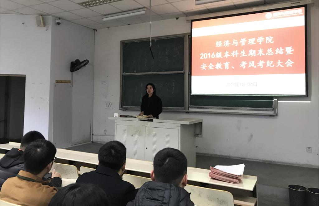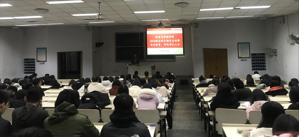为进一步贯彻落实学校、学院关于防诈骗、考风考纪、安全教育、就业指导的工作要求,深入增强学生安全防范意识,巩固提升学院学风建设,12月24日,tyc1286太阳成集团2016级本科生于弘毅楼E302室召开期末总结暨安全教育、考风考纪大会。本次大会由16级辅导员王聪、付凯主持,16级全体学生参加。