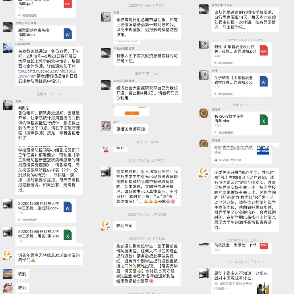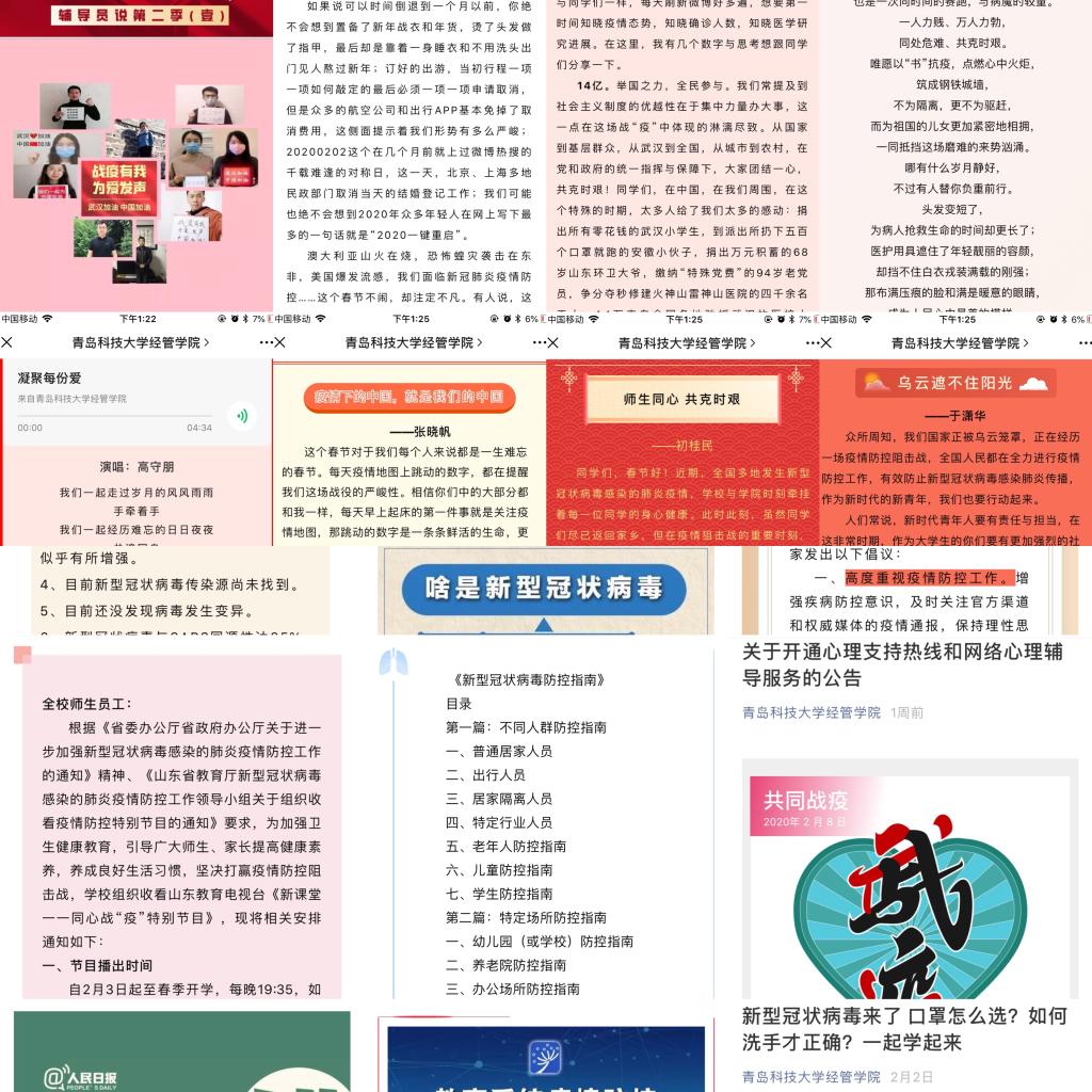 疫情期间,学院带领辅导员队伍立即进入工作状态,及时了解学生动态,做好思想引领工作,推出辅导员说第二季,以书信为媒介,引领学生坚定理想信念,打赢思想、管理、心理、平安四大疫情防控战。自“停课不停学”号召发出以来,学院围绕人才培养目标和各年级学习要求,为学生梳理好在线学习平台及在线学习课程,多种形式鼓励学生做好学业规划,任课教师督促并检查学生学习进度,辅导员组织同学们进行线上学习打卡及晨读活动,通过做好学业指导,引导学生合理规划时间,用好线上资源,做到停课不停学、疫情不恐慌。