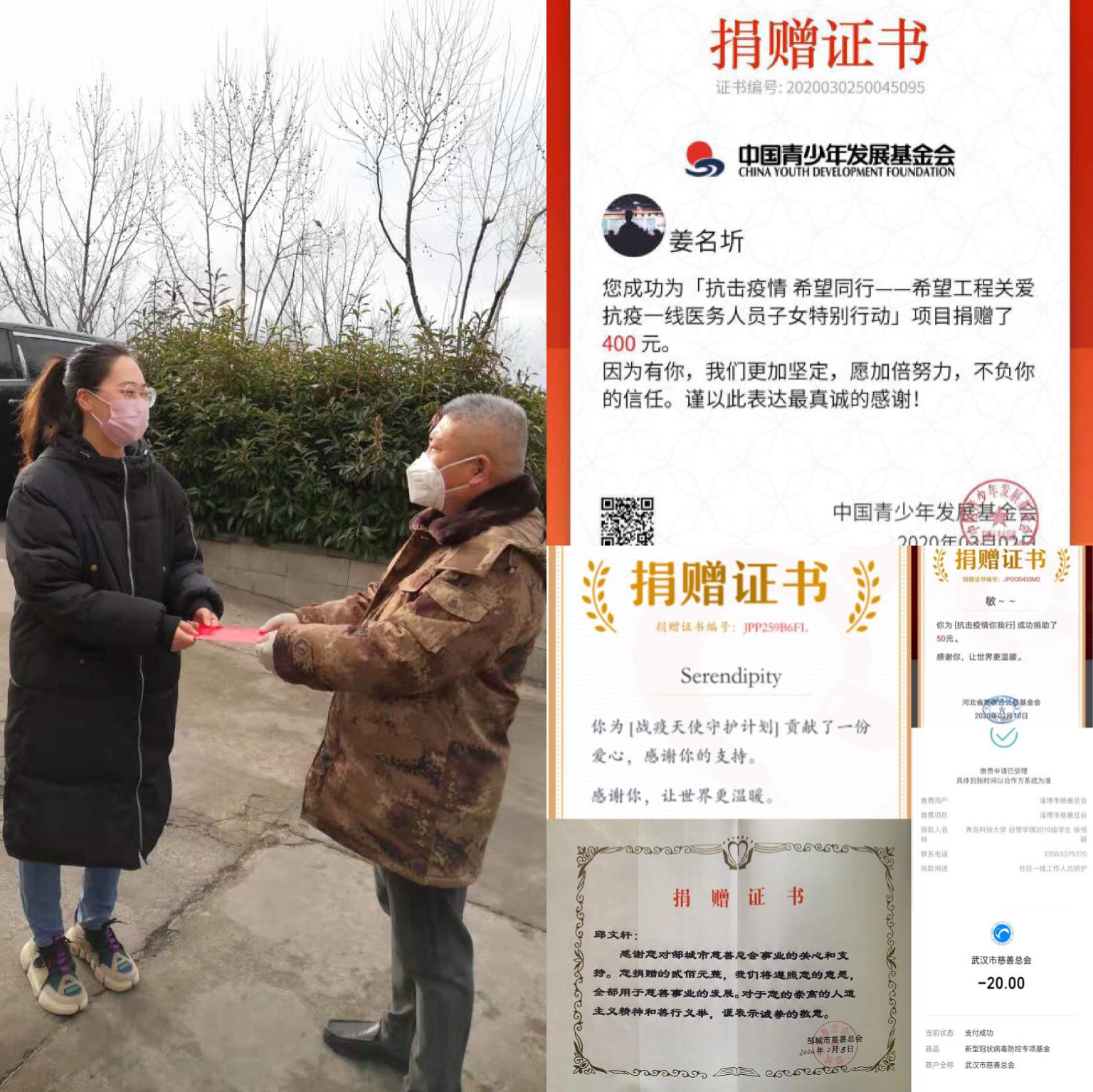 在这场战役中,人人都是参与者,人人都是见证者。财务管理(3+4)161班曲飞、财务181班邱文轩、营销162班韩苗苗、财务192班王心雨、营销192班阚晓敏、ACCA192班张恒硕等同学纷纷通过官方渠道积极参与到疫情防控捐款活动中,为抗击疫情贡献爱心。其中,担任tyc1286太阳成集团崂山校区学生会执行委员会主任及城管171班长的姜名圻同学不仅主动捐款500元,并且号召全班同学根据自身情况为抗击疫情自愿捐款,带领同学提高责任意识、增强奉献精神。