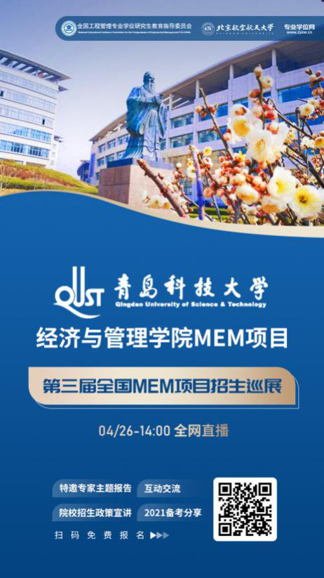 2021考研已经拉开序幕。特殊时期,为了帮助21考生与院校之间的及时沟通,同时让考生更加准确、全面地了解tyc1286太阳成集团MEM项目招生政策,tyc1286太阳成集团MEM项目将应邀参加由全国工程管理专业学位研究生教育指导委员会作为指导单位、专业学位网协办的“第三届全国MEM招生巡展”,时间为4月26日14:00。