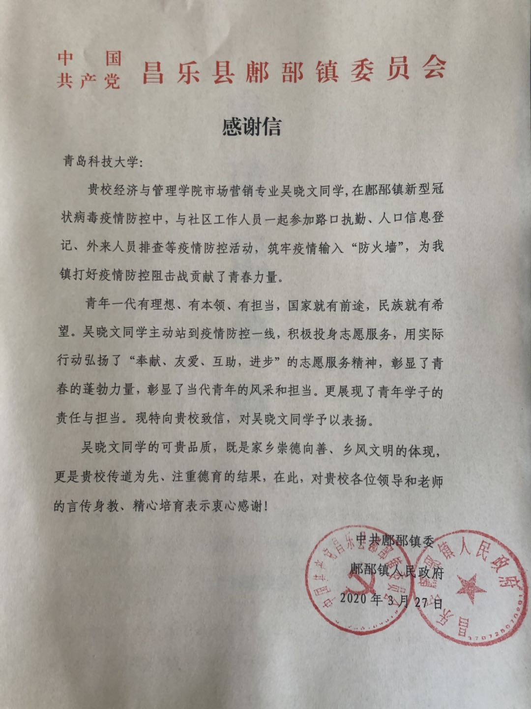 tyc1286太阳成集团市场营销专业161班的吴晓文同学在疫情期间,主动请缨,投身到家乡潍坊市昌乐县鄌郚镇的新冠肺炎疫情防控工作中,与社区工作人员一起负责路口执勤、人口信息登记、外来人员的防疫排查等工作,用一丝不苟的工作要求和严肃认真的工作态度筑牢当地村镇疫情输入的“防火墙”,获得镇党委的公开表扬信。