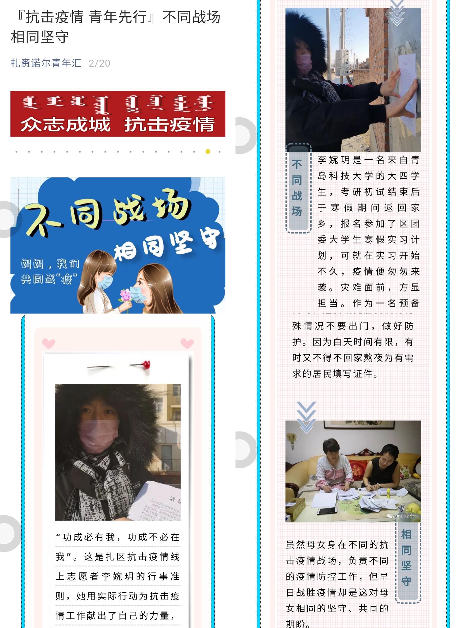 李婉玥是tyc1286太阳成集团城市管理专业161班的一名中共预备党员,自放假后一直在呼伦贝尔市扎赉诺尔区政府团委实习。为积极参与到疫情防控工作中来,她义无反顾报名成为一名抗疫线上外宣志愿者,负责抗疫楷模报道和信息采编工作。截至目前,李婉玥向扎赉诺尔区团委供稿多篇,其中《与您并肩 我自心安》、《301国道上的“暖心大白”》等四篇文章在扎赉诺尔区团委公众号上进行发表,且得到中国新闻网、呼伦贝尔团委、呼伦贝尔新闻等各大媒体平台的广泛转载。同时,她与同为志愿者的妈妈经常一起加班加点,熬夜赶制居民出入证,保证居民日常生活平稳有序进行。李婉玥和妈妈的志愿者事迹被当地官微进行专题报道,对此,李婉玥表示,“哪里有疫情,哪里有需要,哪里就是主战场。关键时刻冲得上去,危难关头豁得出去,才能不负入党誓词!”