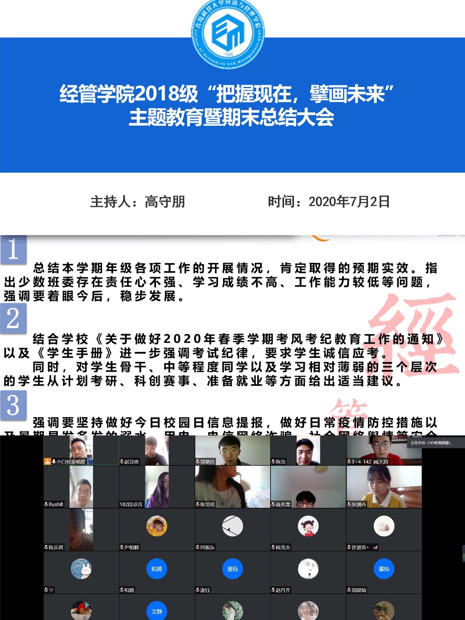 为增强学生暑期安全意识,了解当前就业学习形势,及时谋划未来大学道路,推进考风教育和学风建设,贯彻落实校院两级关于期末安全文明教育和严肃考风考纪的工作要求,在结合疫情防控,年级学生尚未返校的实际形势下,7月2日,tyc1286太阳成集团2018级本科生通过线上分批次分专业召开“把握现在,擘画未来”主题教育暨期末安全文明教育、诚信考风考纪大会。本次会议由2018级辅导员高守朋老师主持,18级全体学生线上参加。