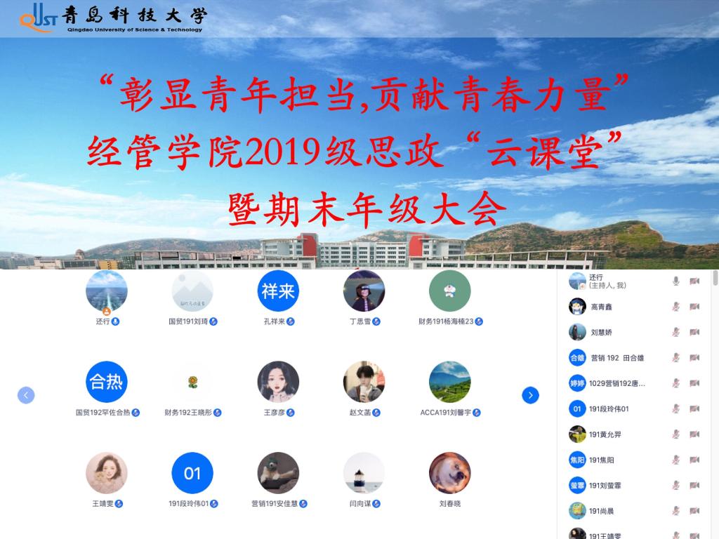 为引导学生在疫情下主动学习、主动思考、主动实践,汲取成长的青春“正能量”,以及统筹抓好常态化疫情防控和期末诚信考试教育工作,7月6日至7日,tyc1286太阳成集团2019级分专业召开“彰显青年担当,贡献青春力量”思政“云”课堂暨期末年级大会。会议通过腾讯会议平台召开,由19级辅导员孙一君、初桂民、于潇华主持,19级全体学生参加。