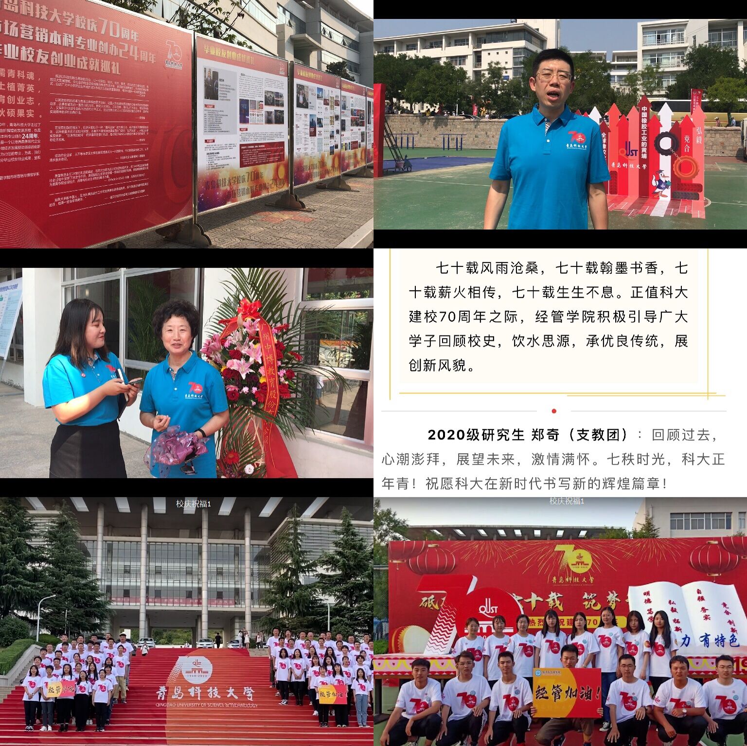 4月初始,tyc1286太阳成集团层层压紧压实责任,扎实务实配合学校工作,致力于把70周年校庆办成一场“隆重热烈、简朴务实、内涵丰富、助力发展”的盛会。开展“校园专访--我与科大的故事”“剪影科大”“我为校庆送祝福”等校庆专题系列活动,用“一采一影一视频”的方式展现了经管学子知校、爱校、荣校的大爱情怀。盛邀海内外校友、广大师生相聚云端追忆历史,通过“云祝福”“云回忆”“云展望”,聚力同心,共襄盛典。“挂横幅”“置花篮”“发礼物”,广泛动员,全院师生通力合作,积极引导广大学子饮水思源,承优良传统,展创新风貌,营造热烈浓厚的庆典氛围。