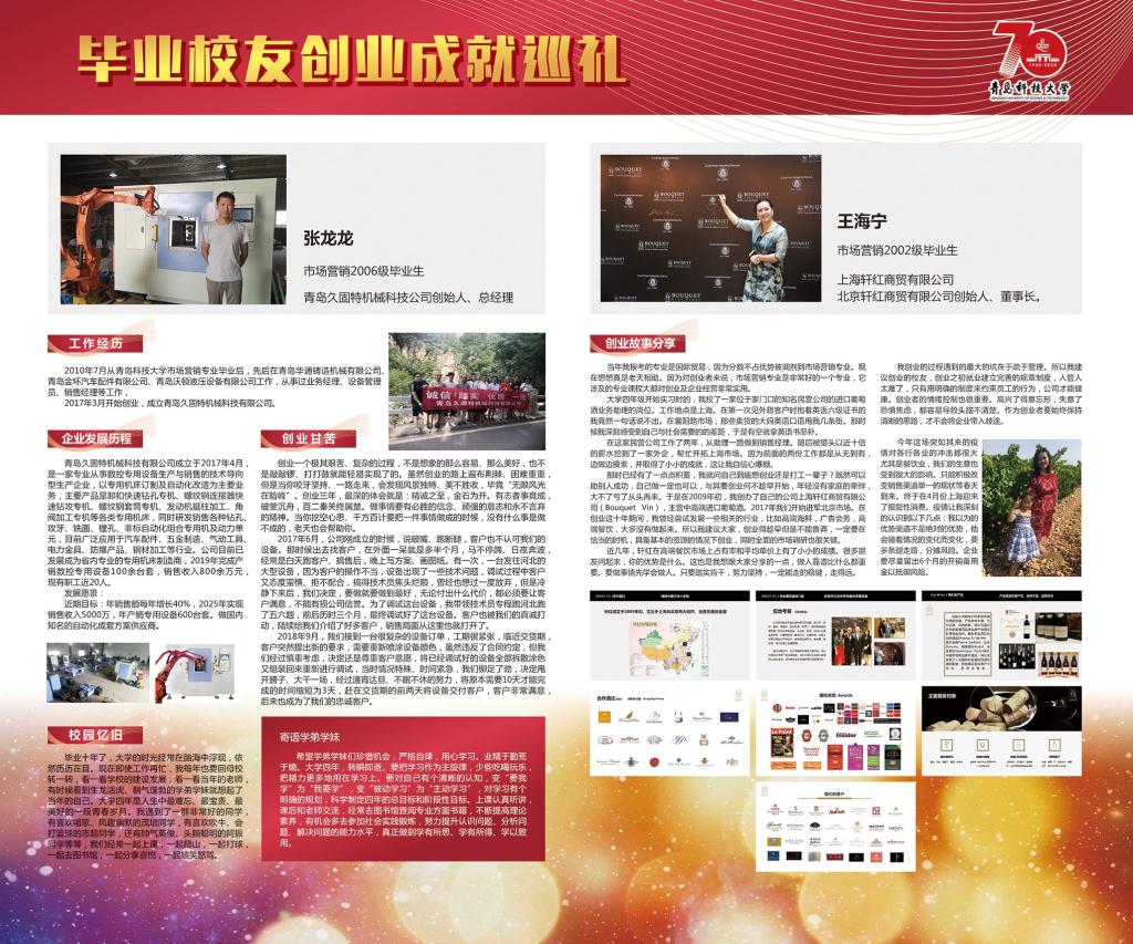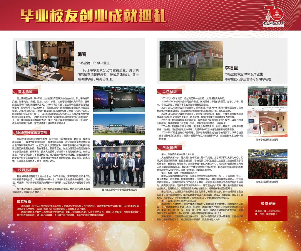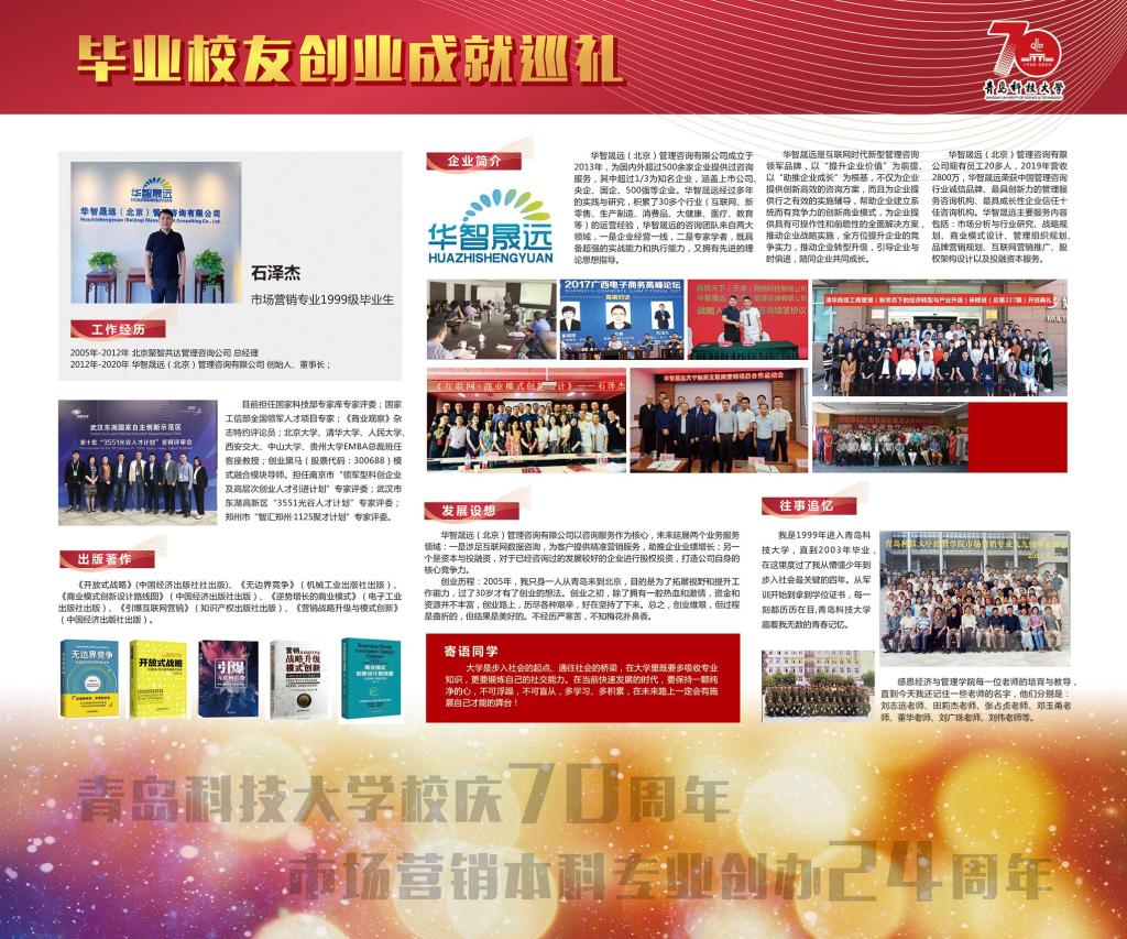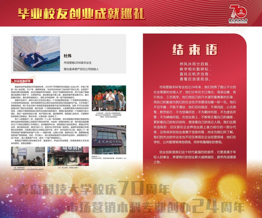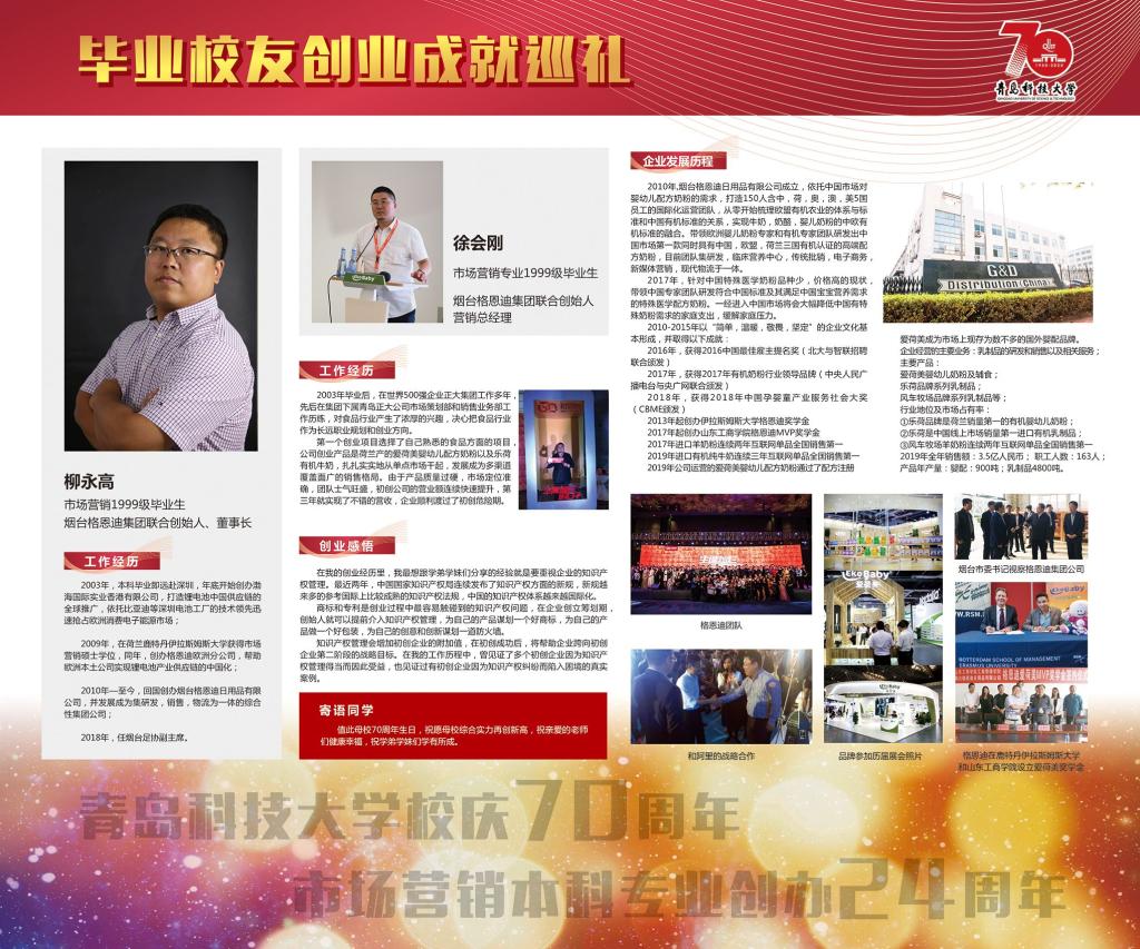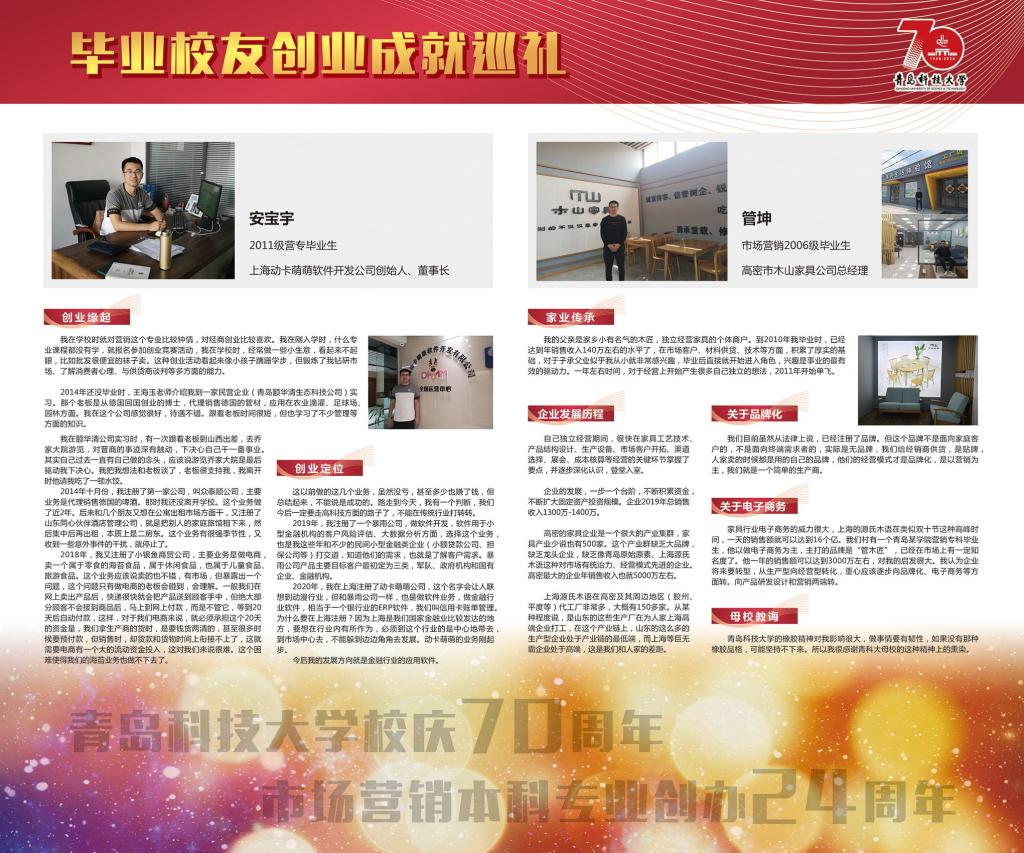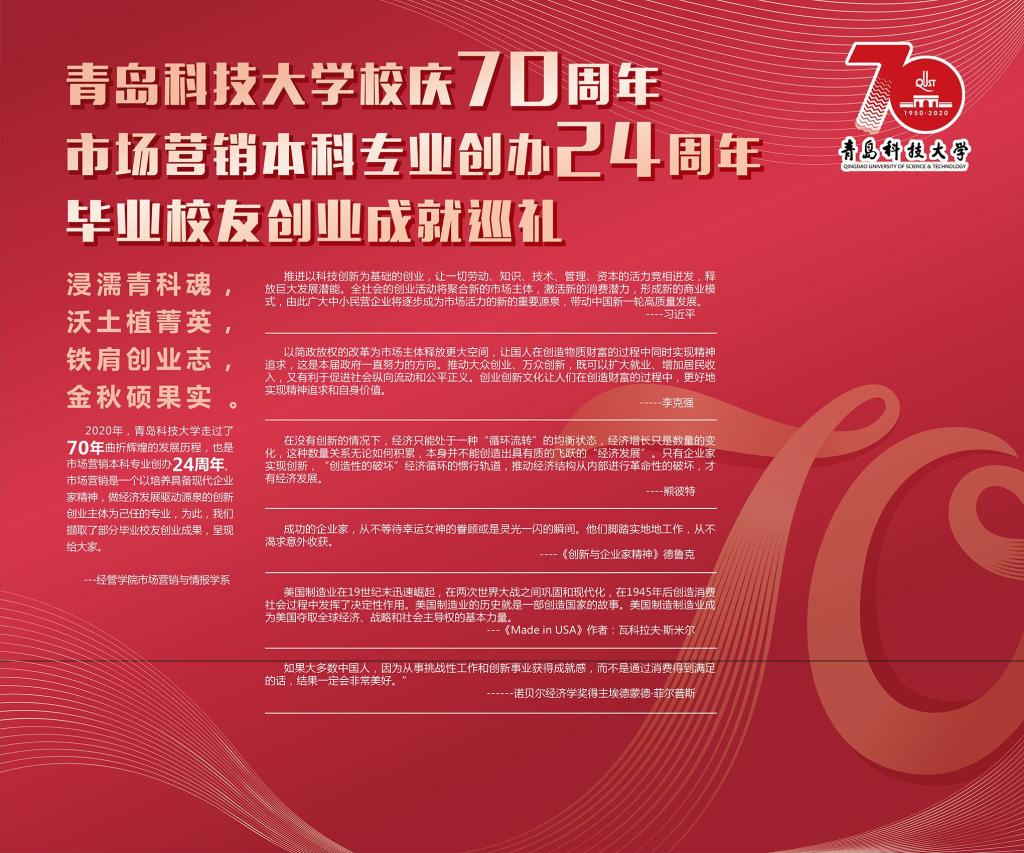 值此校庆70周年之际,太阳成集团市场营销本科专业创办满24周年,为此,tyc1286太阳成集团市场营销系举办了毕业校友创业成就展览,收集了历届校友创业创新活动取得杰出成就的部分素材,制作展览栏于弘毅楼门口进行集中展示。