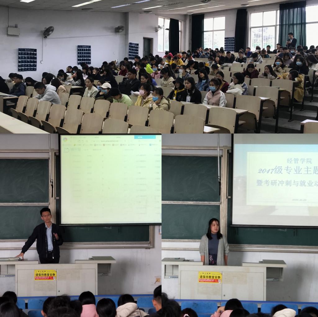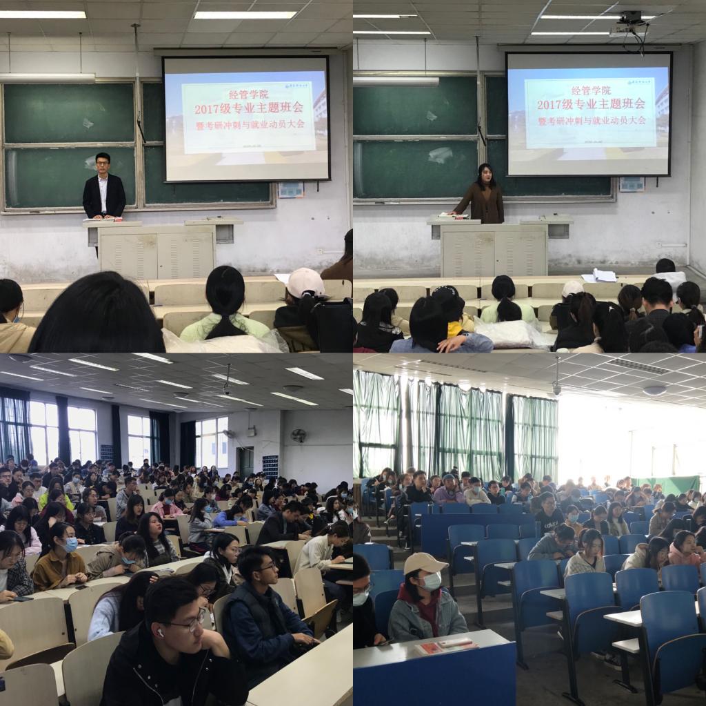 为扎实做好疫情防控常态化下的学生教育管理工作,为学生提供更加精准化服务,2020年10月28日、29日,tyc1286太阳成集团于弘毅楼E303、104室分专业召开2017级考研冲刺与就业动员大会。会议由17级辅导员张显全老师、张鸣老师主持,17级全体学生参加。