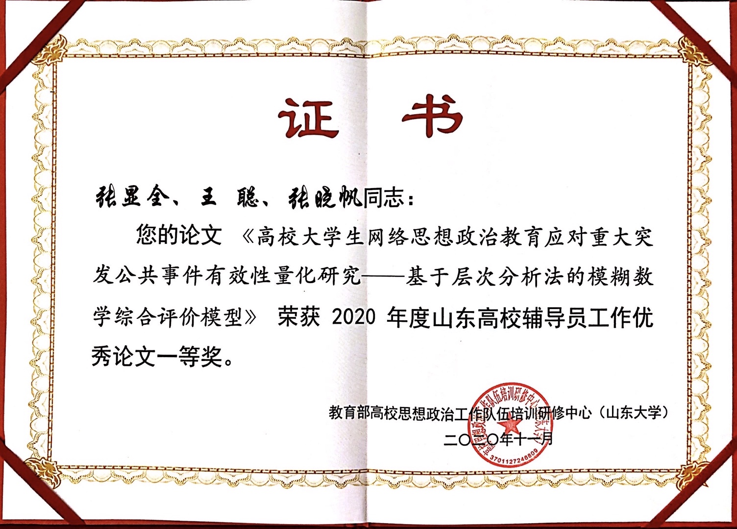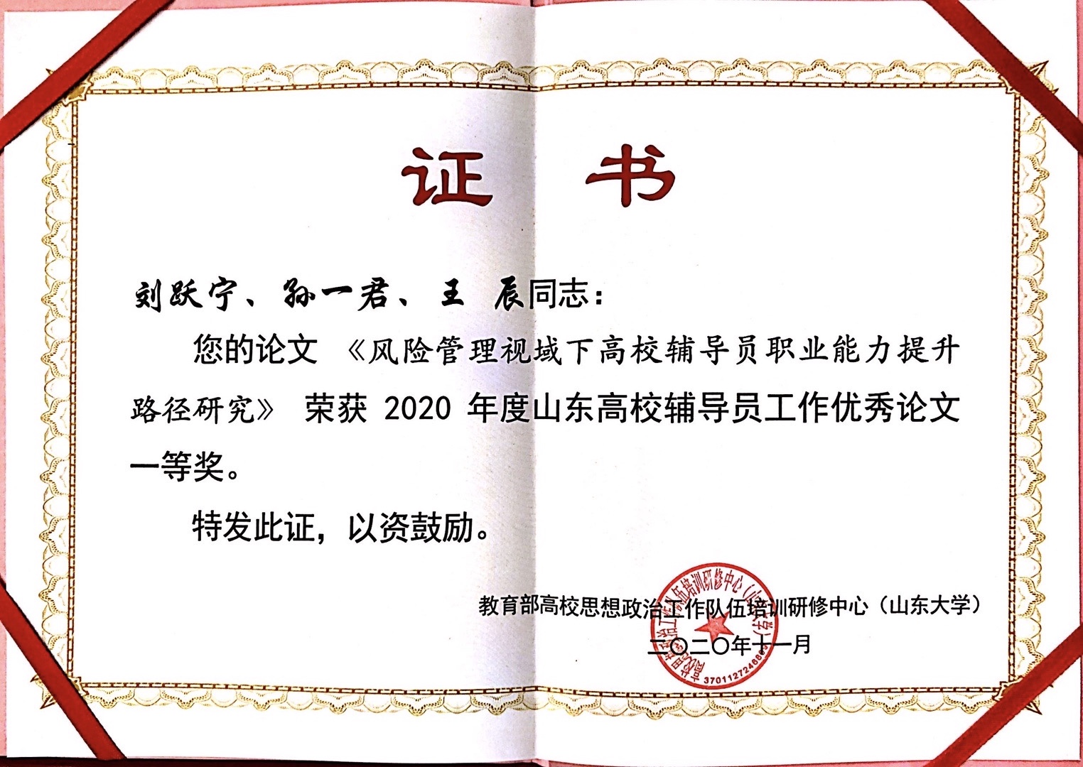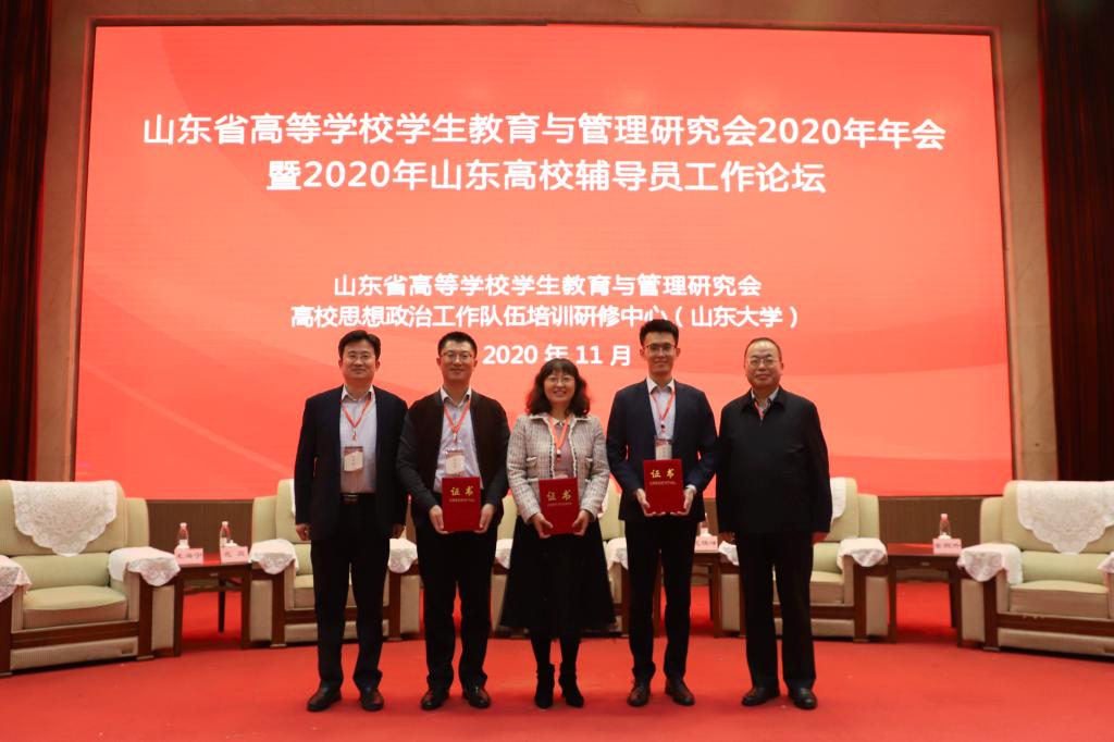 论坛对2020年山东高校辅导员工作论坛获奖论文进行了表彰。全省200余所高校(含高职)推荐的1000余篇论文共有97篇论文获奖(其中一等奖20篇,二等奖33篇,三等奖44篇)。学校共有3篇论文获奖(其中一等奖2篇、二等奖1篇),由太阳成集团刘跃宁、孙一君、王辰撰写的《风险管理视域下高校辅导员职业能力提升路径研究》,张显全、王聪、张晓帆撰写的《高校大学生网络思想政治教育应对重大突发公共事件有效性量化研究——基于层次分析法的模糊数学综合评价模型》两篇论文获得一等奖,获奖数量和质量均有重大突破。