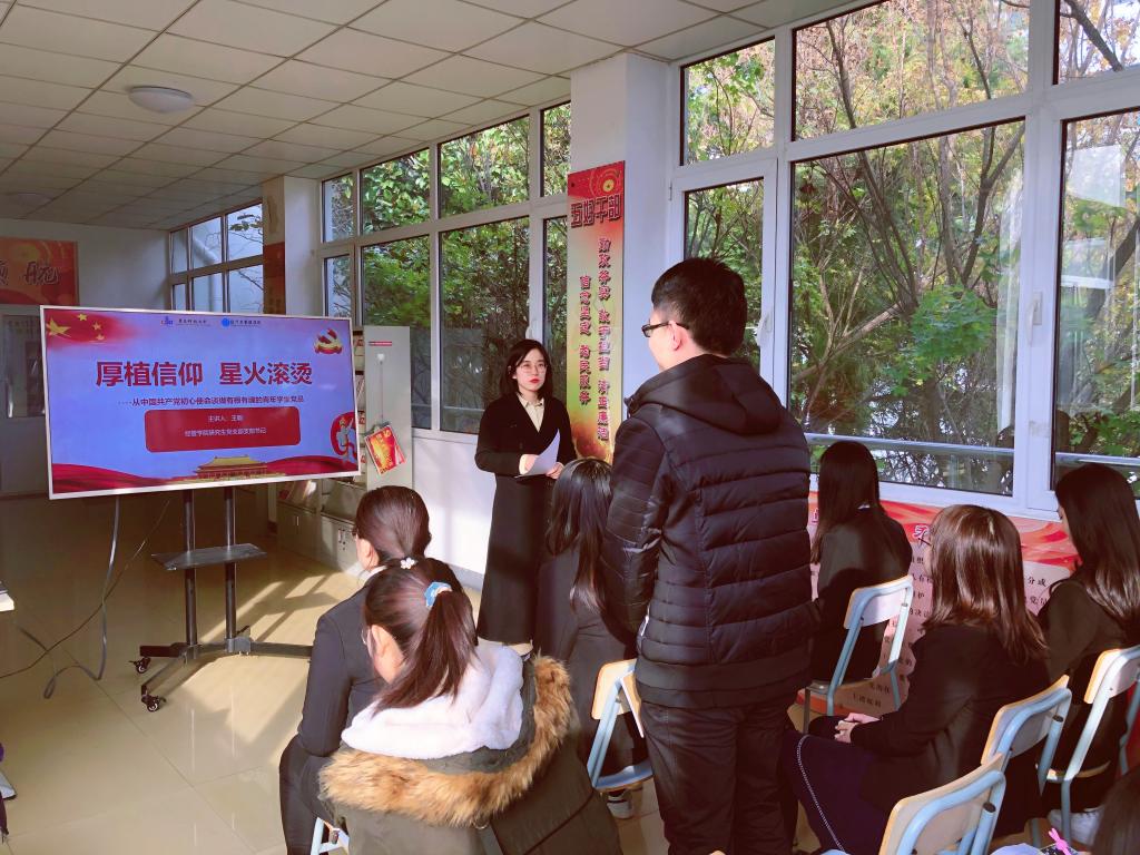 为深入学习贯彻党的十九届五中全会精神、深化“四史教育”,强化党支部堡垒建设以起到武装党员、教育党员、凝聚党员的作用,11月24日,tyc1286太阳成集团于经管楼党建活动室举行“厚植信仰,星火滚烫”专题党课及“诵读红色经典,传承红色精神”主题朗读活动。