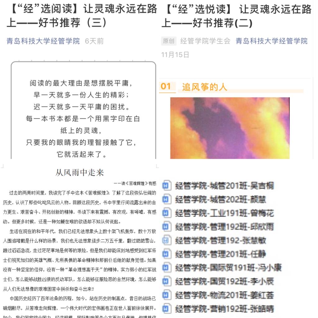 同时,tyc1286太阳成集团利用线上线下同时发力,通过微信公众号、经管小石头、易班等线上平台开展“好书推荐”系列活动,经管学子通过热烈讨论,交流心得,深化读书感想,指导自身行动,并号召全院学生培养读书习惯,争做读以修身,涵养品德的先行者,做传承经典、引领风尚的实践者。同时,学院组织学生在阅读后撰写心得感悟,交流读书体会,将所想所感付诸笔尖,进一步将读书意识在实践中传播与秉承。