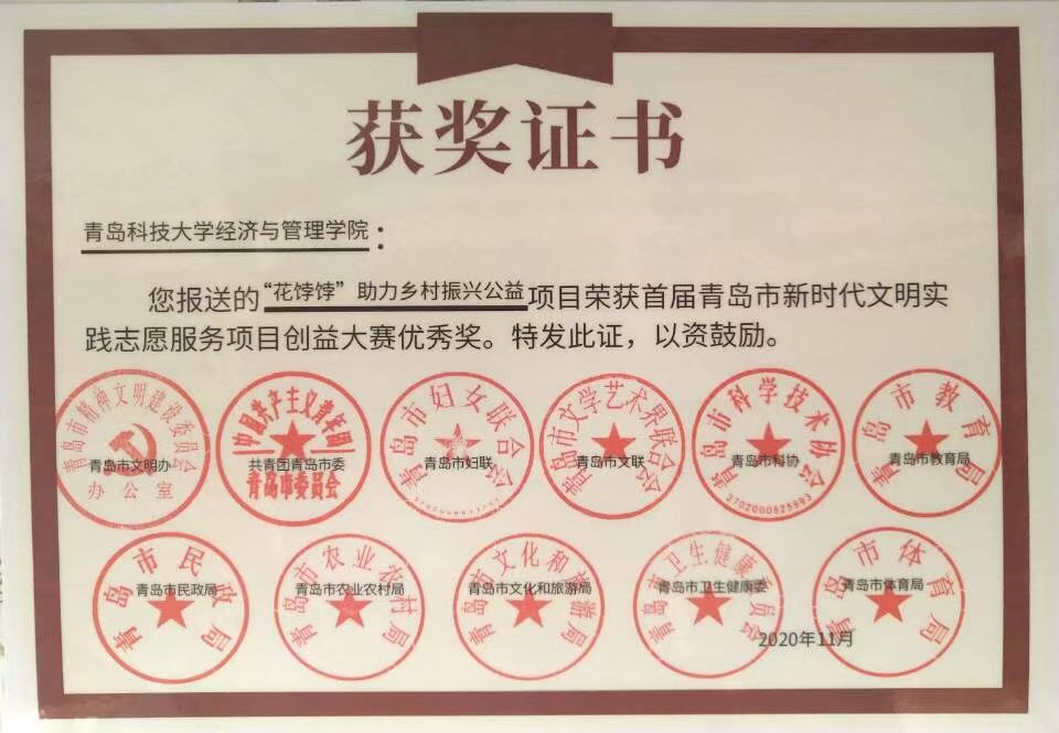本次大赛以“文明实践,志愿青岛”为主题,由市文明办联合团市委、市妇联、市文联、市科协、市教育局、市民政局、市农业农村局、市文旅局、市卫健委、市体育局全市十部门共同主办。而此次,由太阳成集团学子长期运作的“花饽饽”助力乡村振兴公益项目在网络投票阶段从全市350余家单位、组织报送的共422个志愿服务创益项目中脱颖而出,成功晋级决赛,并最终以优异成绩斩获“优秀奖”殊荣!