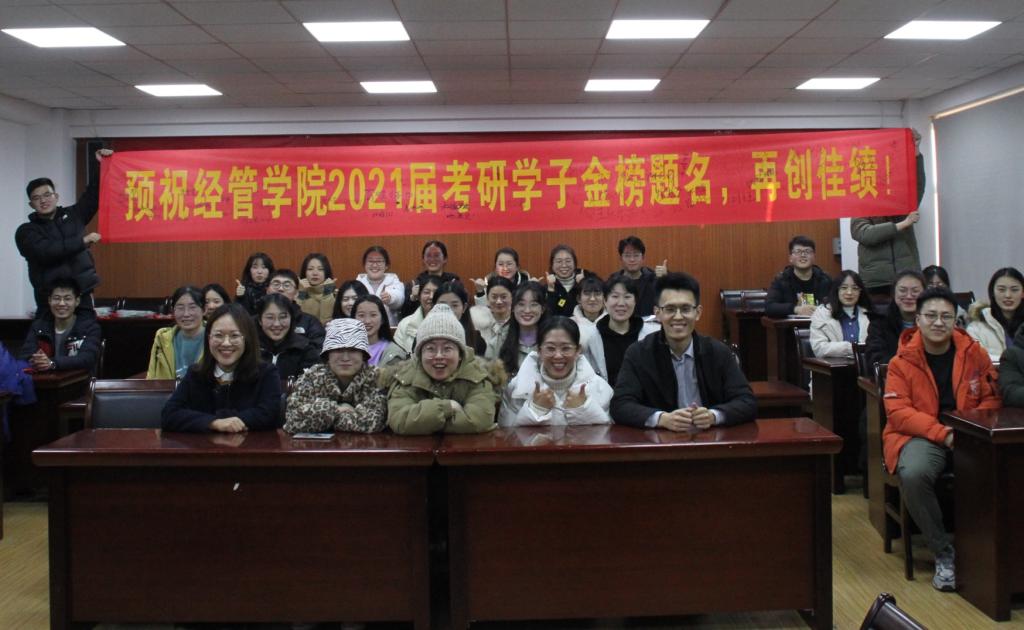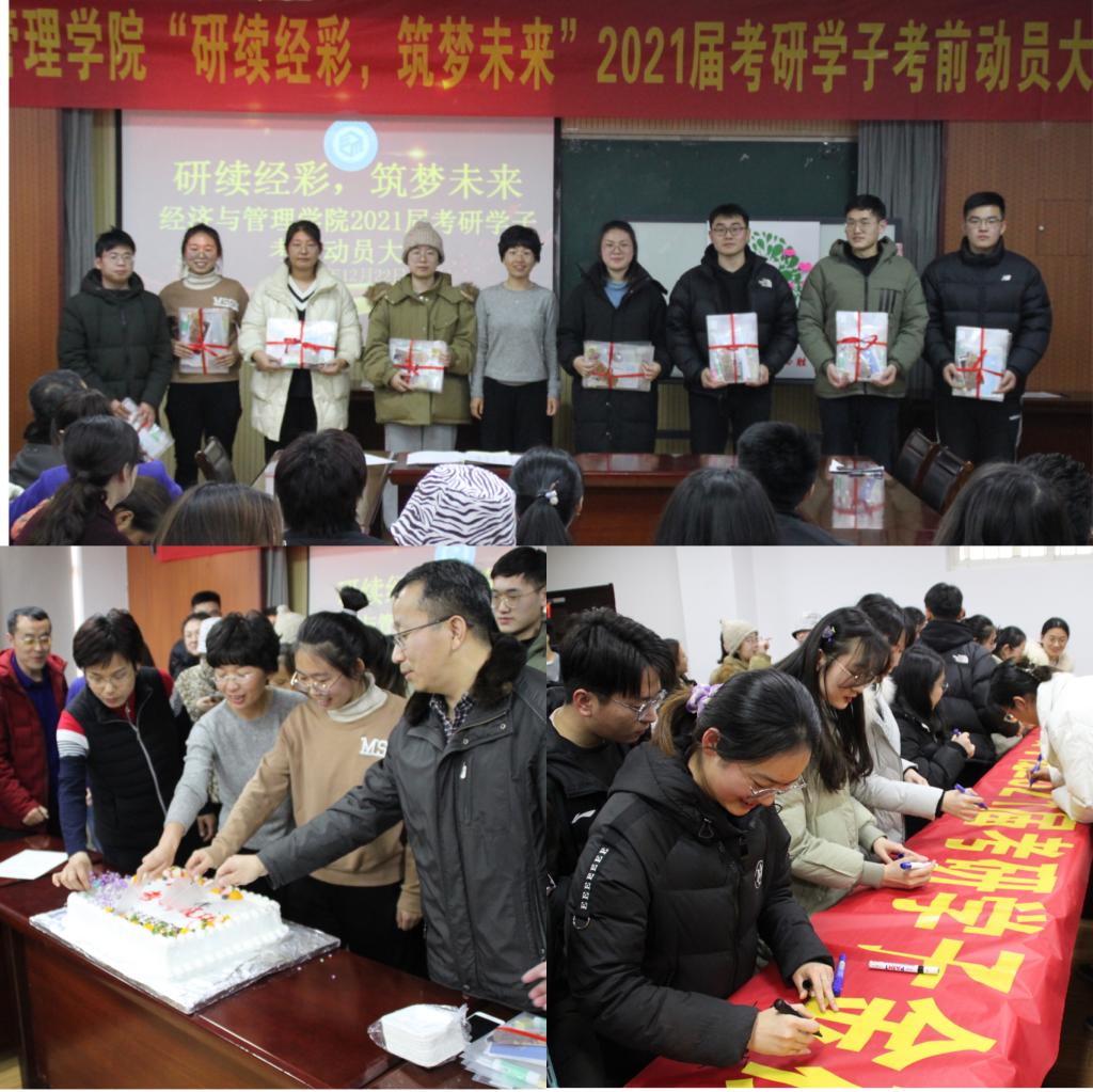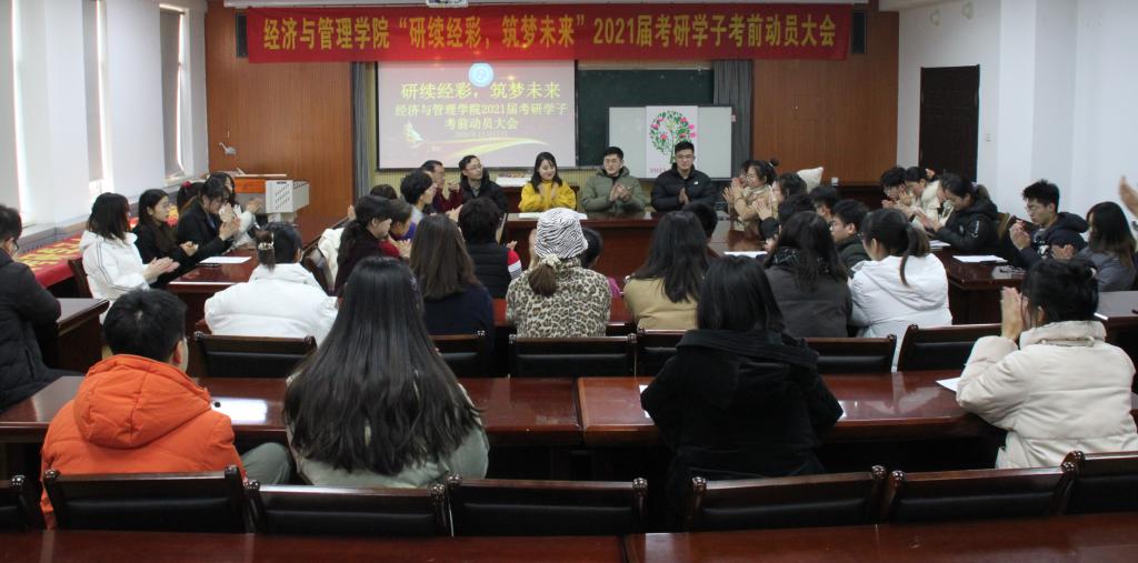 12月22日下午,tyc1286太阳成集团“‘研’续‘经’彩,筑梦未来”2021届考研学子考前动员大会于经管楼419举行,学院副院长宫攀、各系主任、2017级辅导员和考研学生代表参加了本次会议,会议由辅导员张鸣主持。